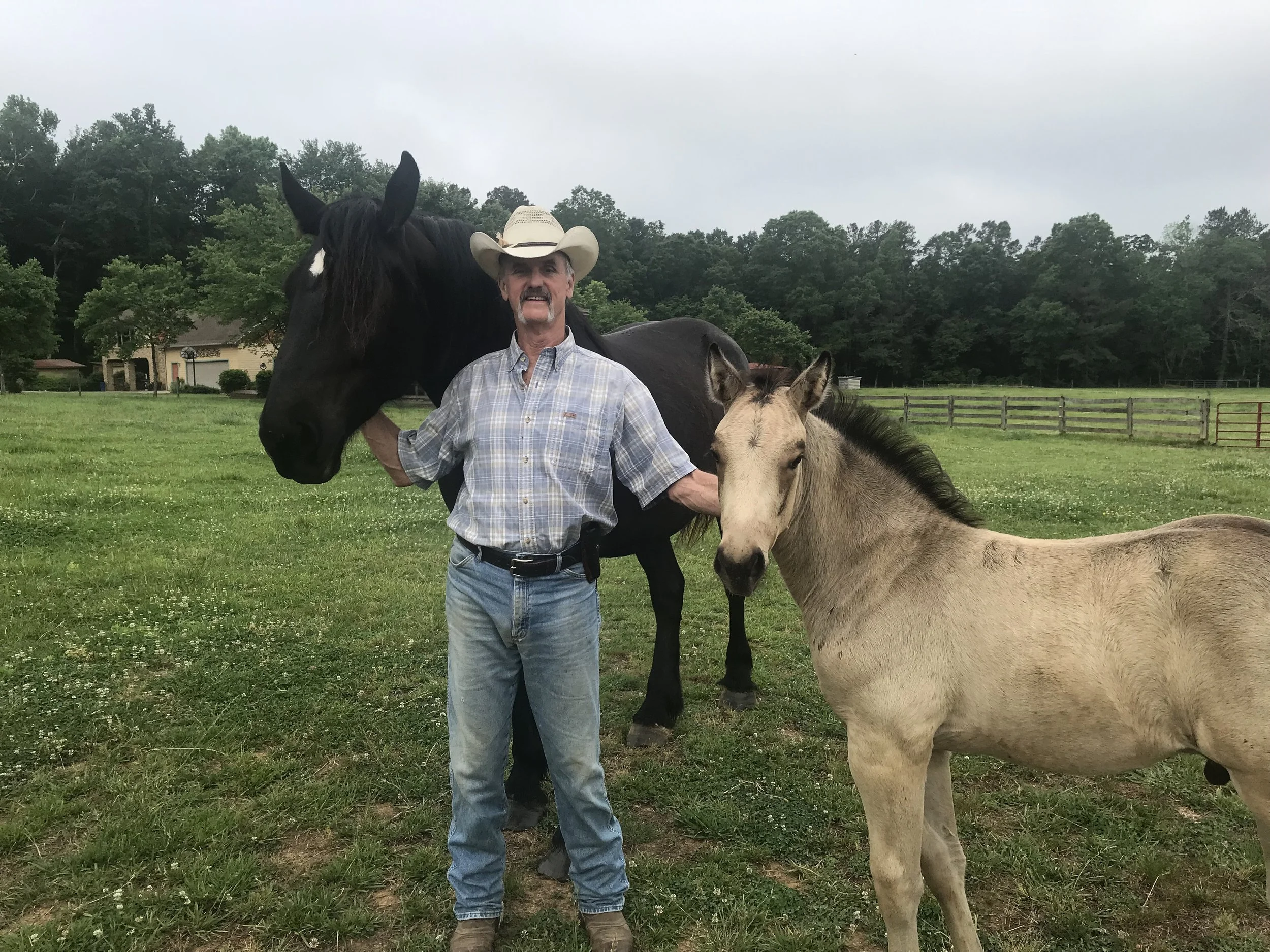 A man in a plaid shirt and cowboy hat standing in a grassy field with a black horse on his left and a light-colored foal on his right. The man is smiling and holding the horses gently.