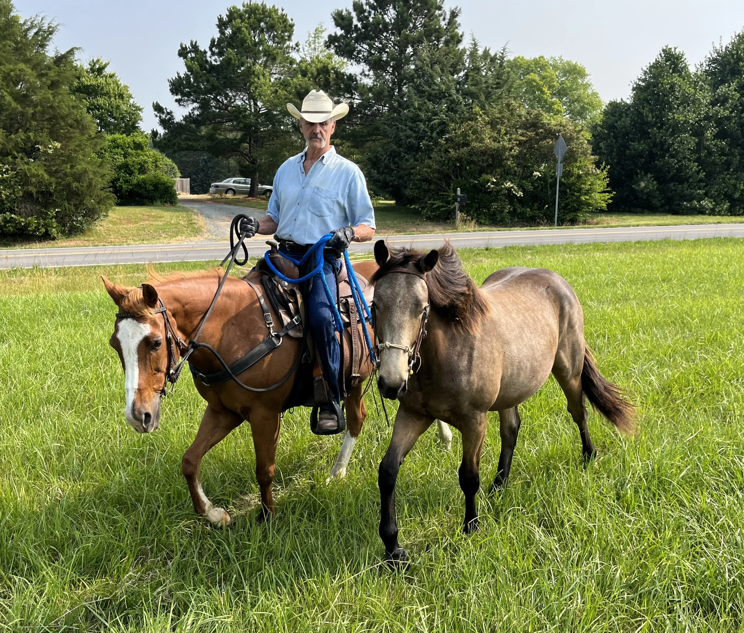 A man riding a brown horse with a white face paint, holding reins and a second small gray horse standing nearby on a grassy field with trees and a road in the background.