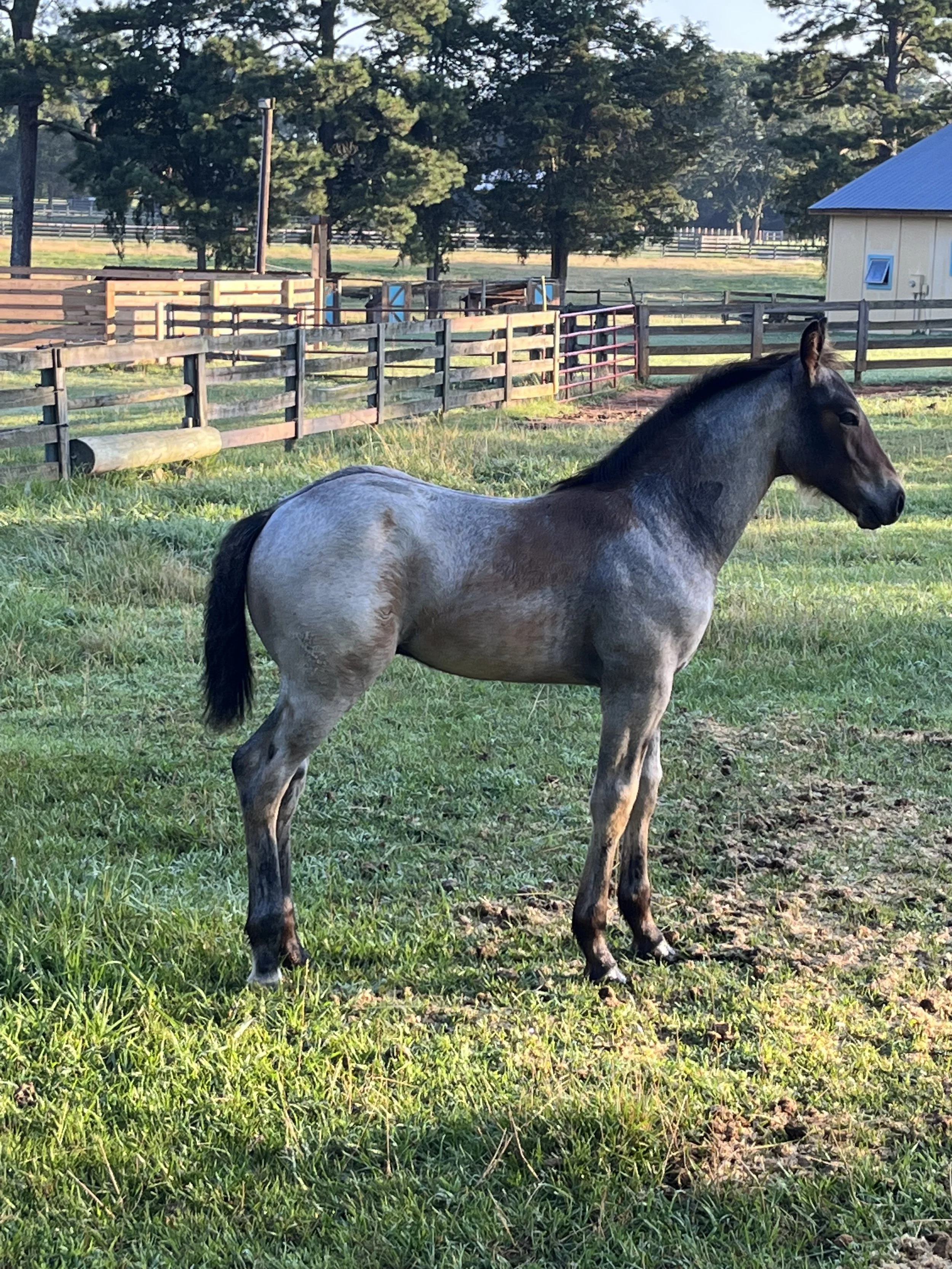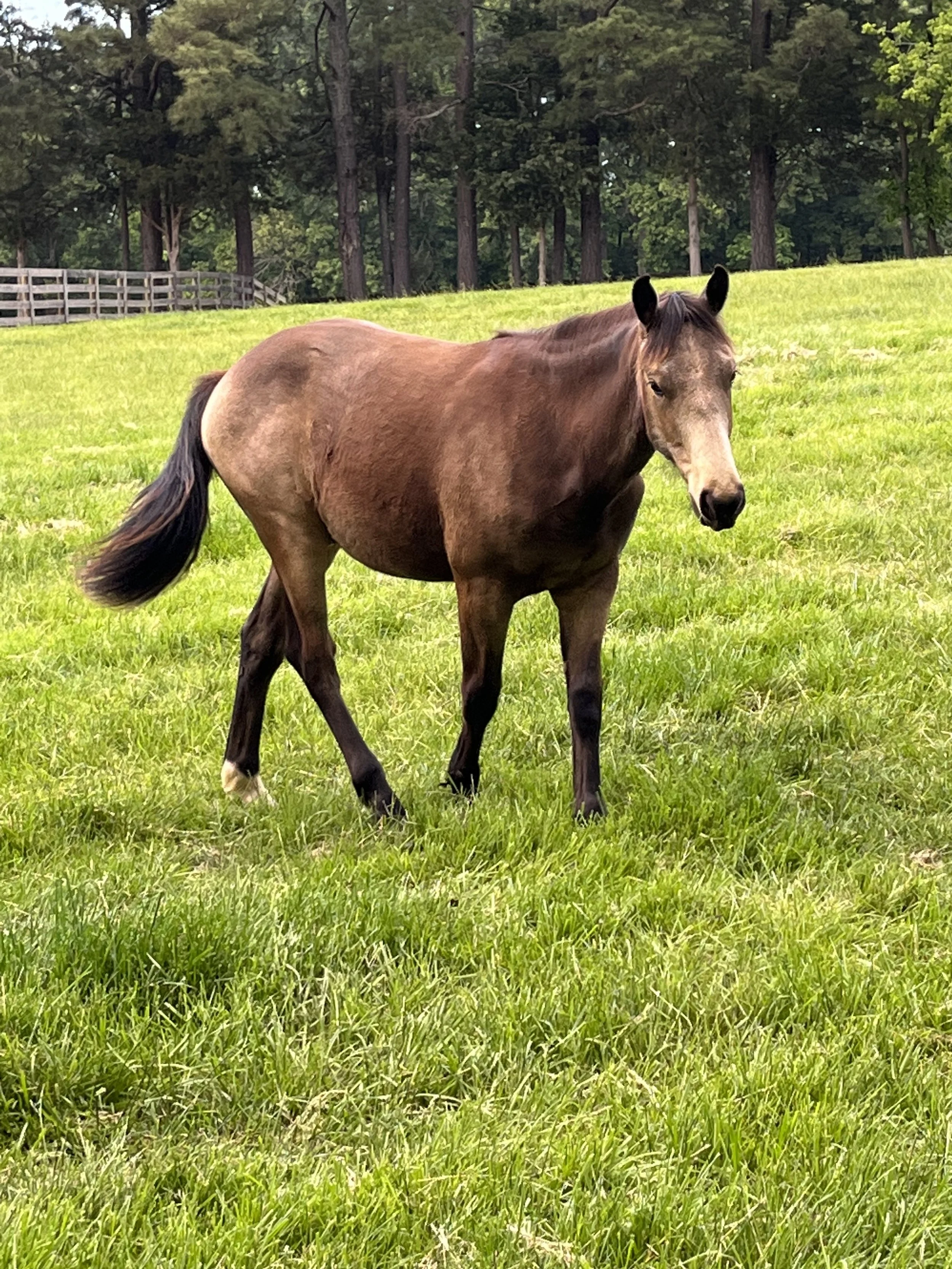 A young horse standing in a grassy field with trees and a wooden fence in the background. View fullsize