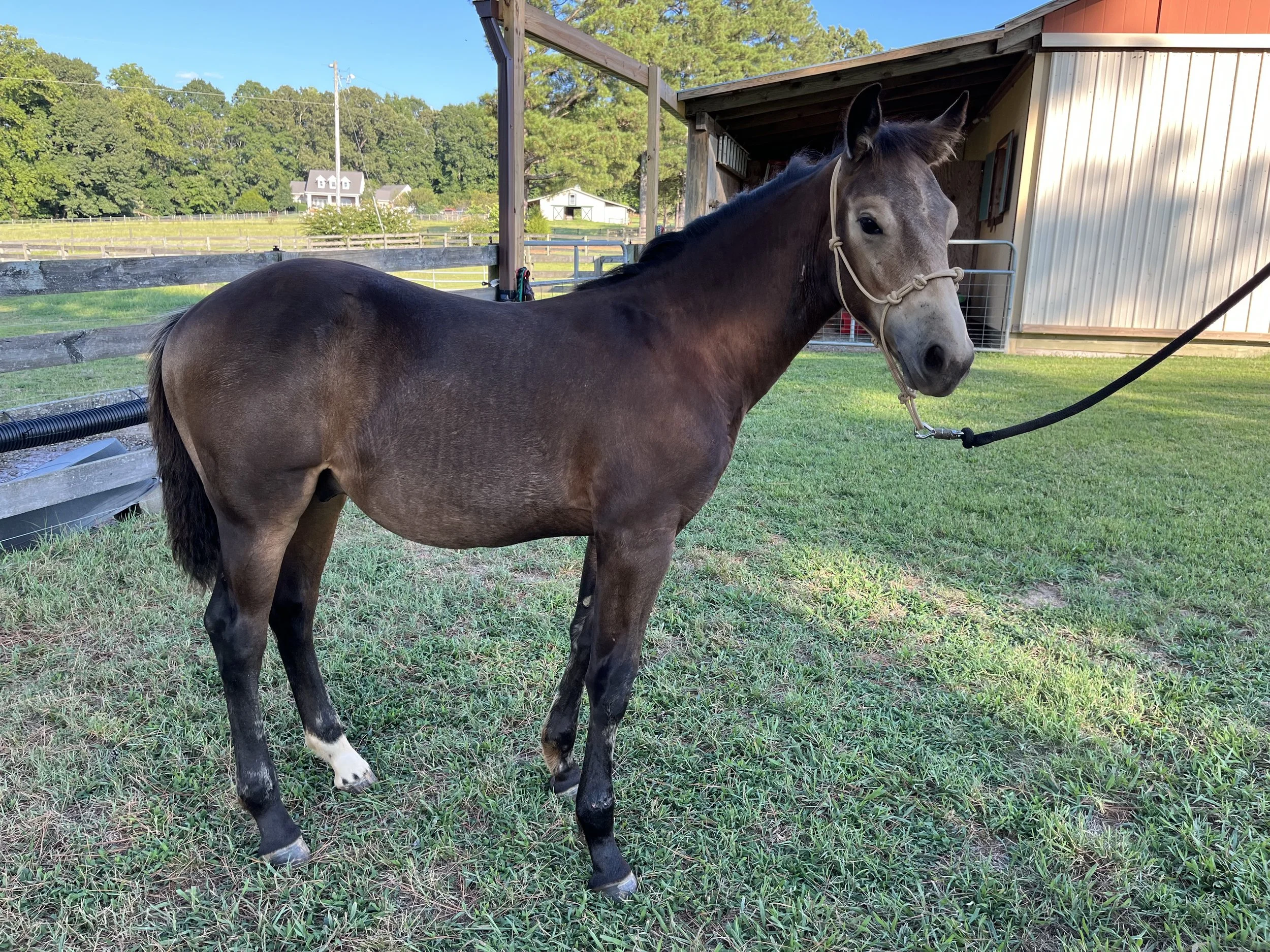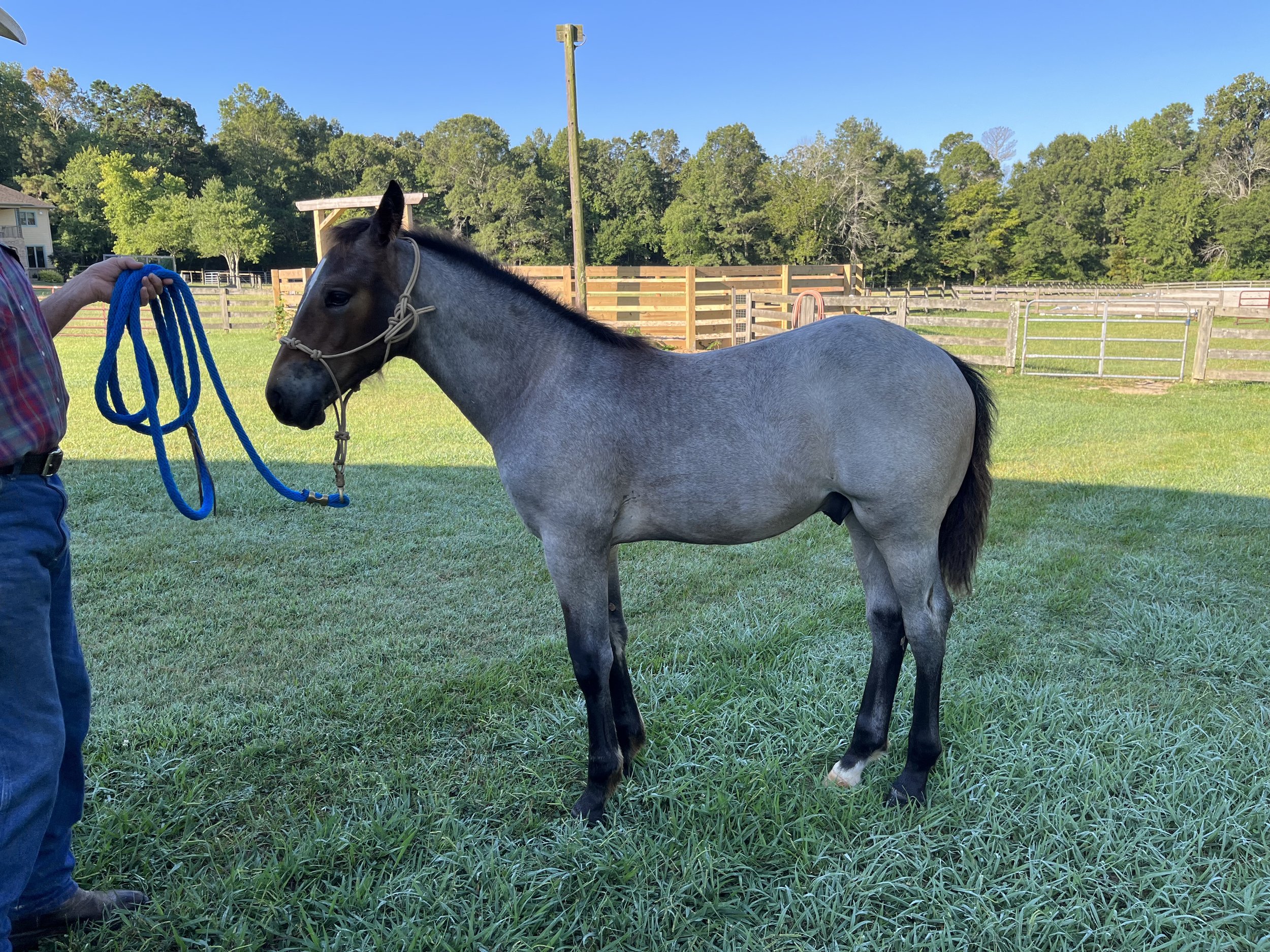 A grey horse with a dark mane standing on green grass in a fenced outdoor area, with a person holding a blue lead rope. View fullsize