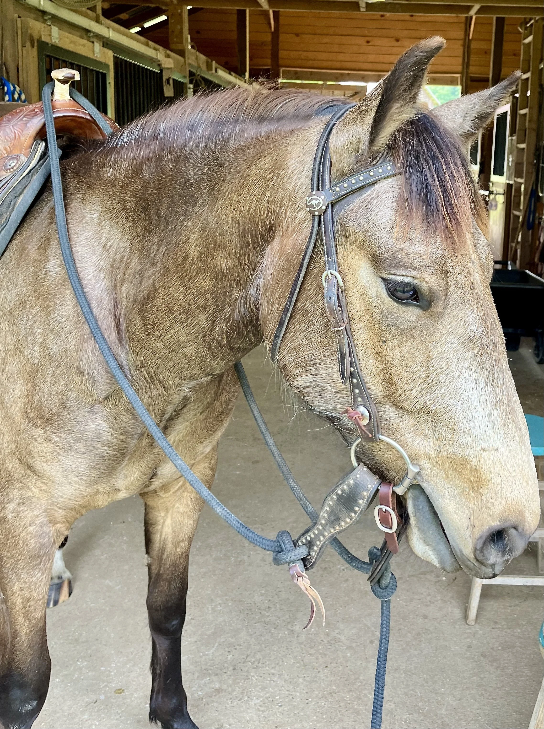 A brown horse with a saddle and bridle standing inside a wooden stable View fullsize