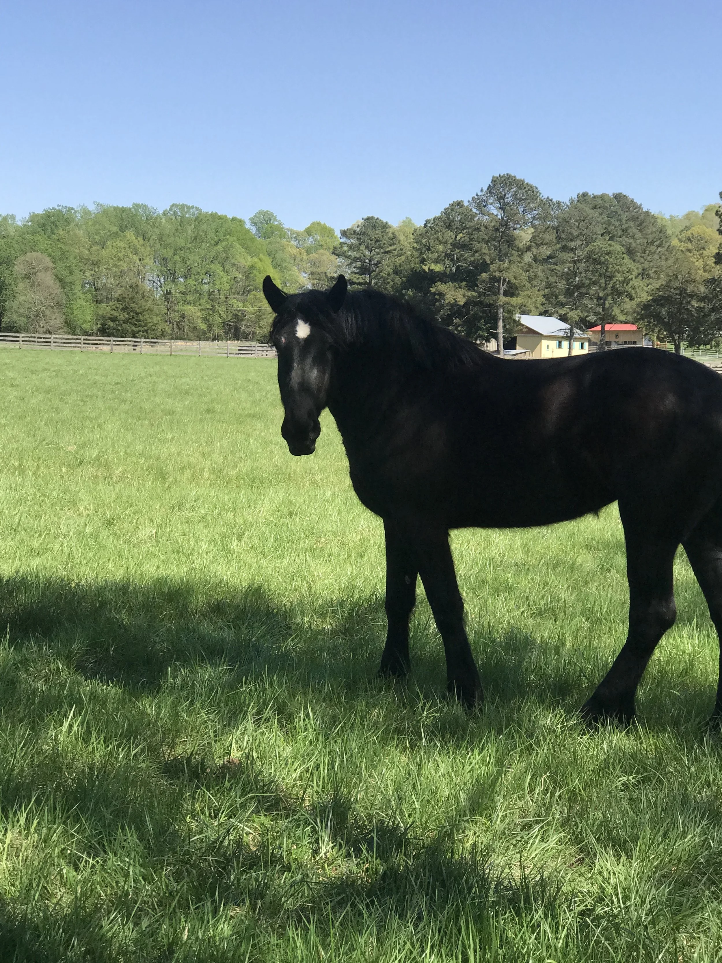 A black horse standing in a grassy field with trees and farm buildings in the background under a clear blue sky.