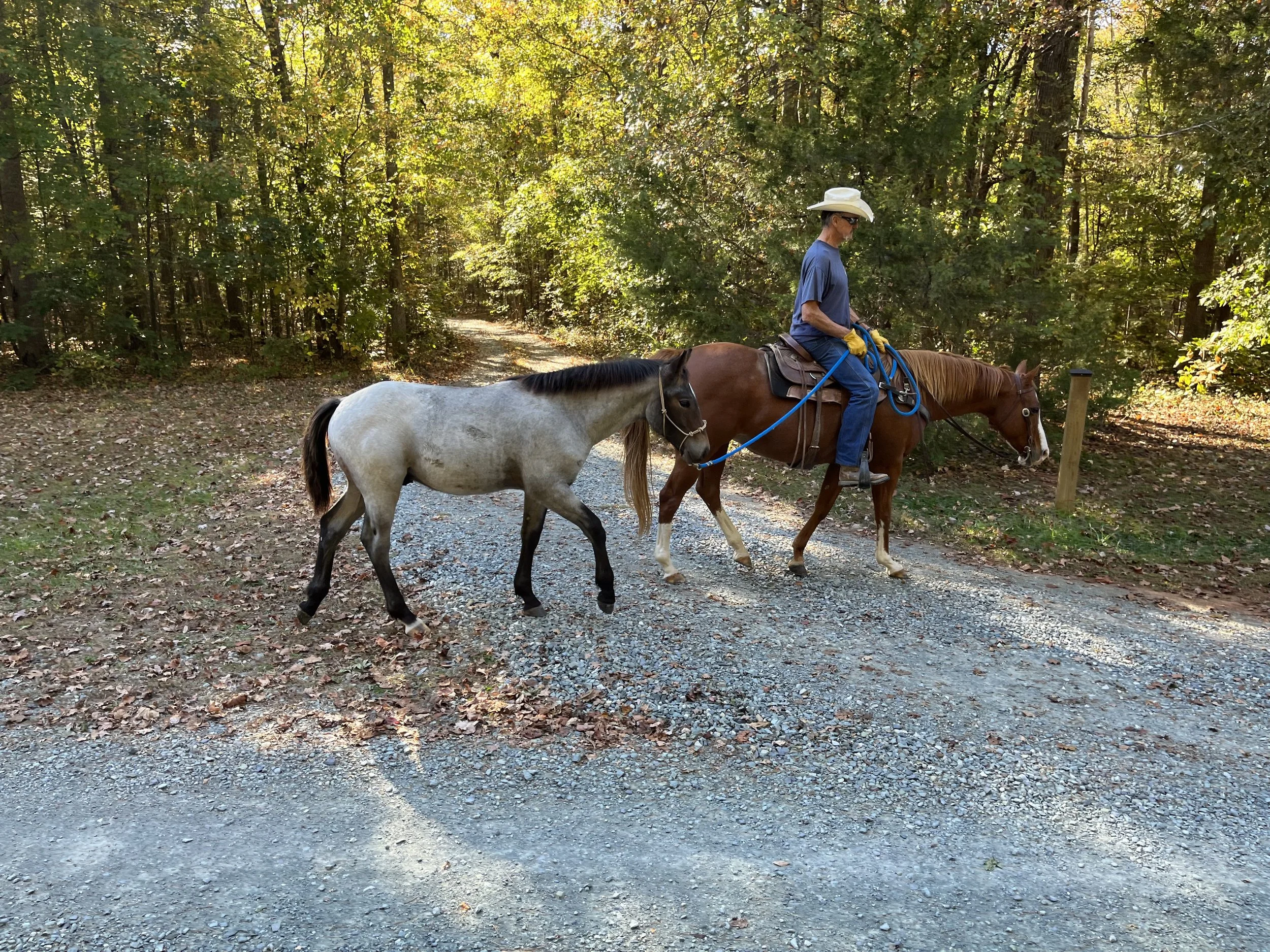 A man riding a brown horse with a white blaze on its face and white socks on its front legs, while leading a gray and black horse on a gravel trail through a wooded area during daytime.