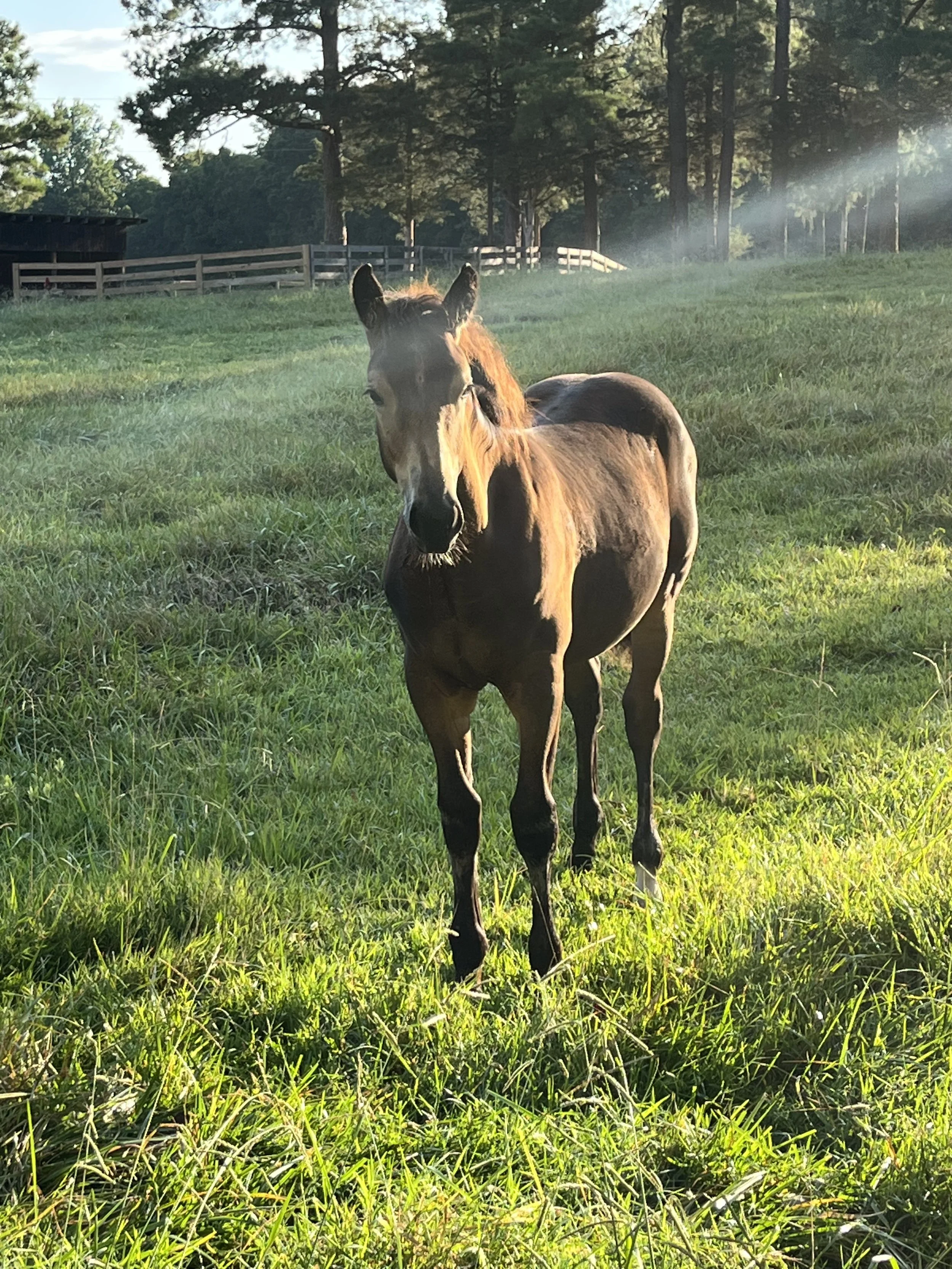 A young brown horse standing in a grassy field with trees and a fence in the background, illuminated by sunlight. View fullsize