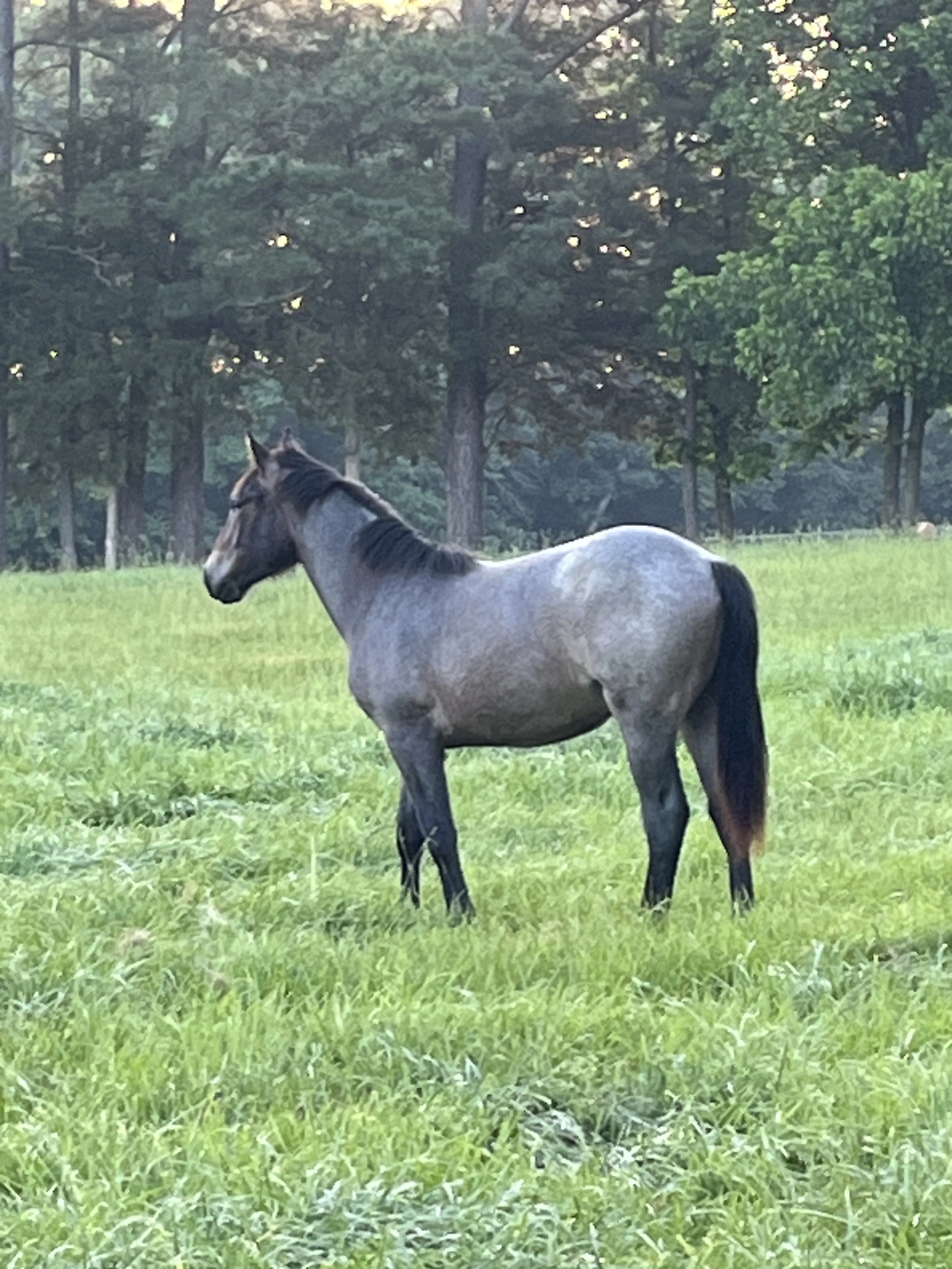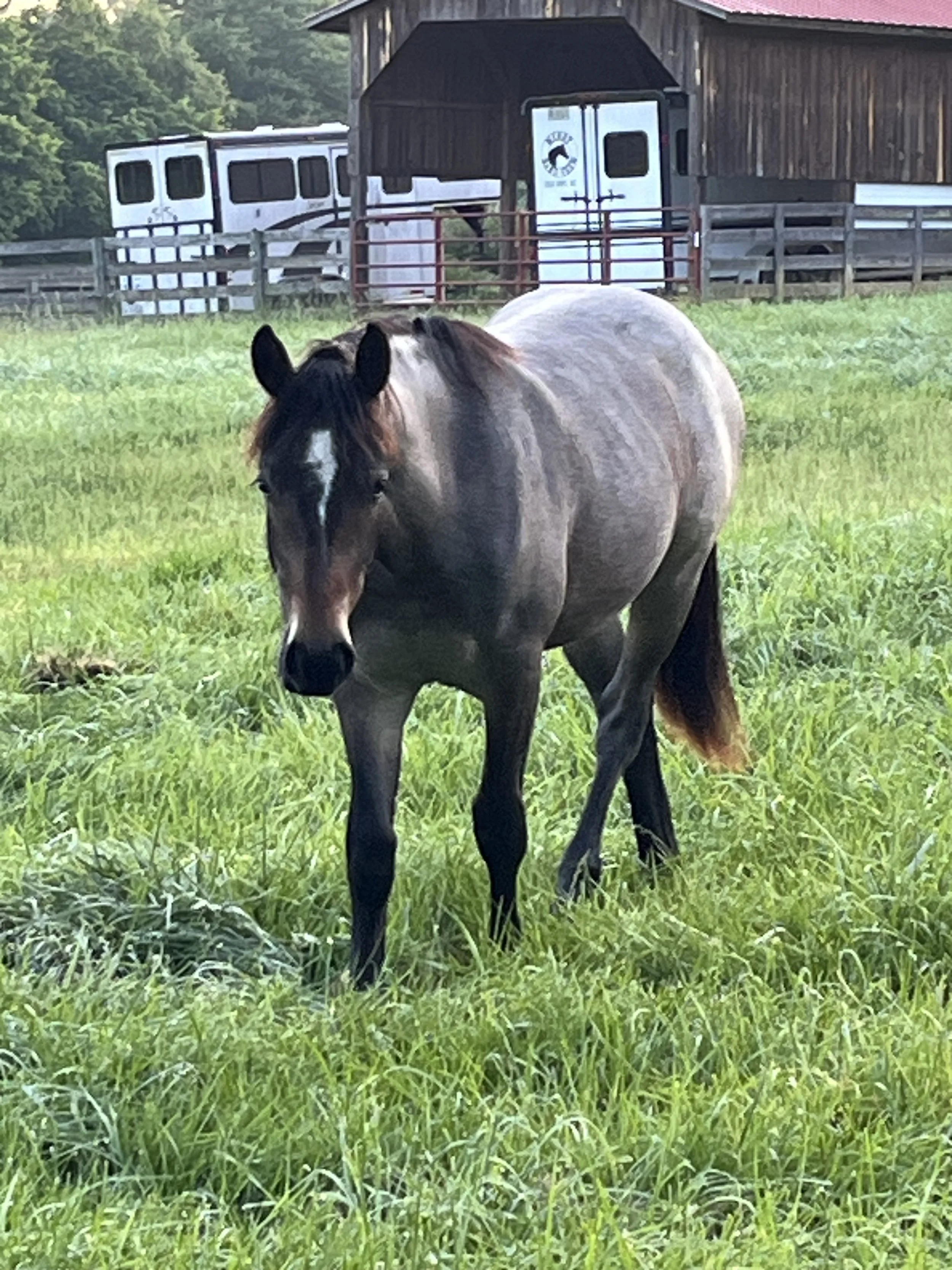 A gray horse with a brown face and black mane and tail standing in a grassy field, with trees and a wooden fence in the background. View fullsize