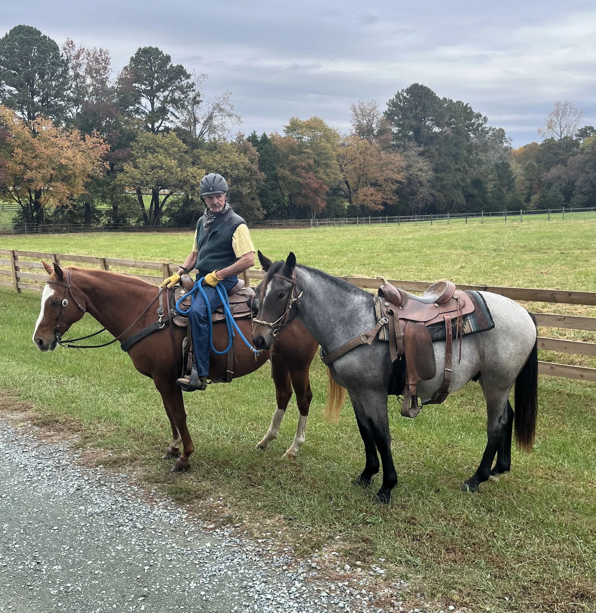 A man riding a brown horse and holding the reins of a gray horse, both saddled, on a grassy field with a wooden fence and trees with autumn foliage in the background. View fullsize