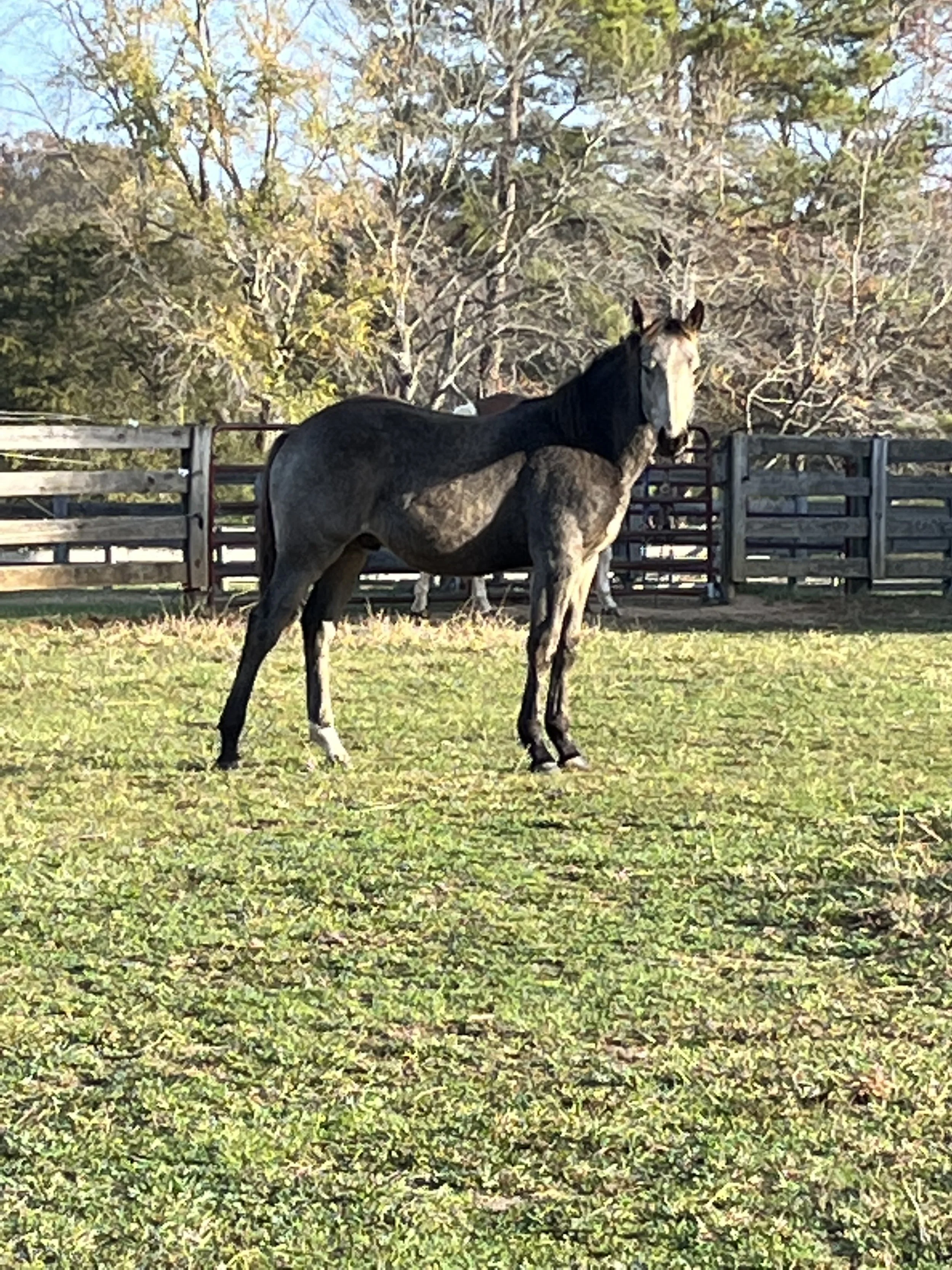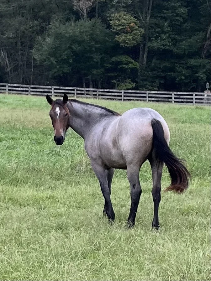 A gray horse with a brown face and black mane and tail standing in a grassy field, with trees and a wooden fence in the background.
