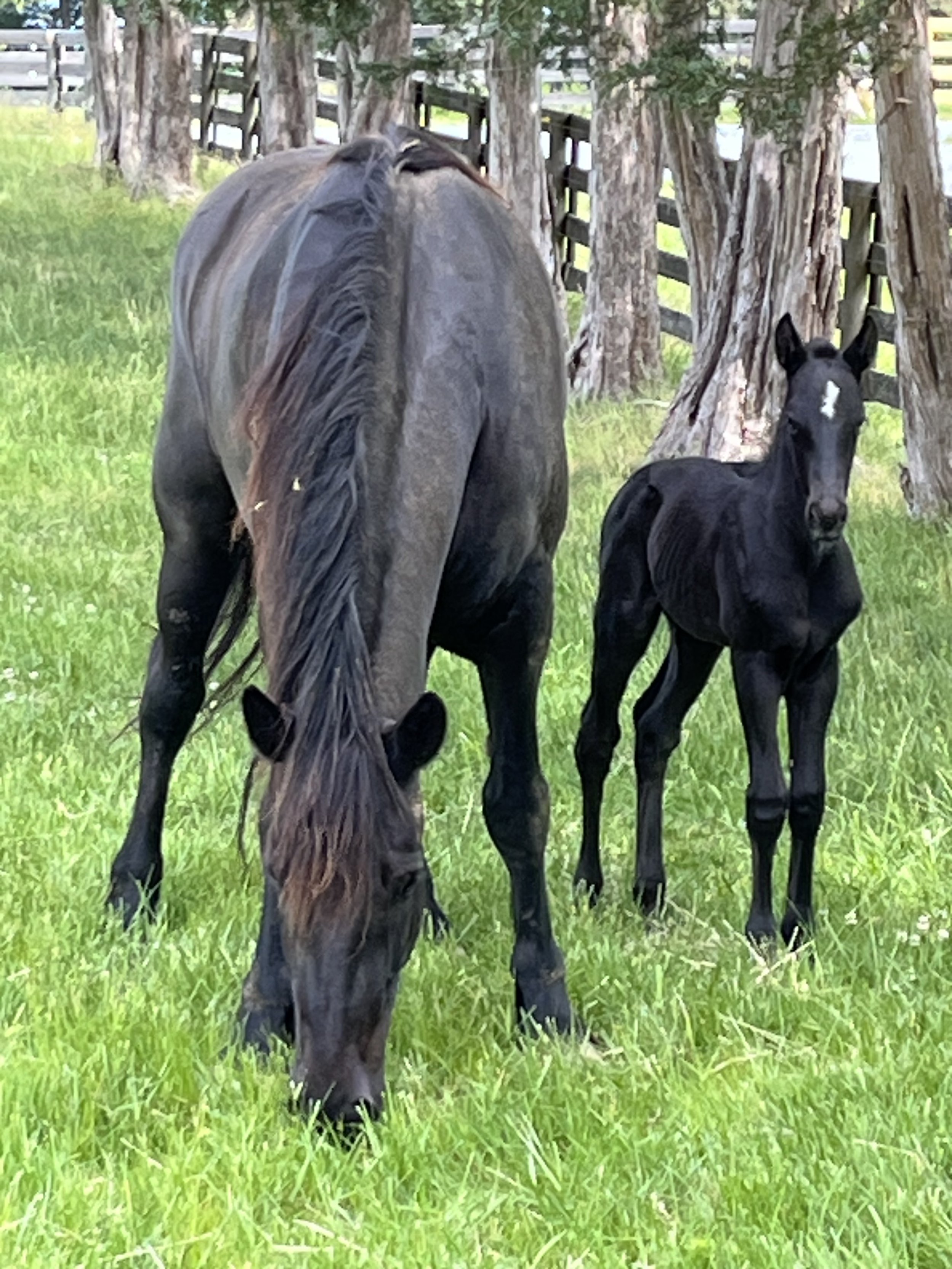 A black horse and foal grazing on a grassy field with trees and a wooden fence in the background. View fullsize