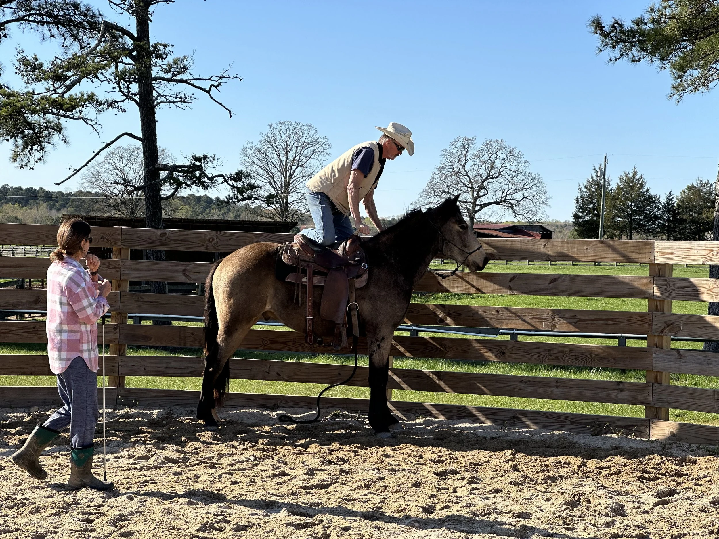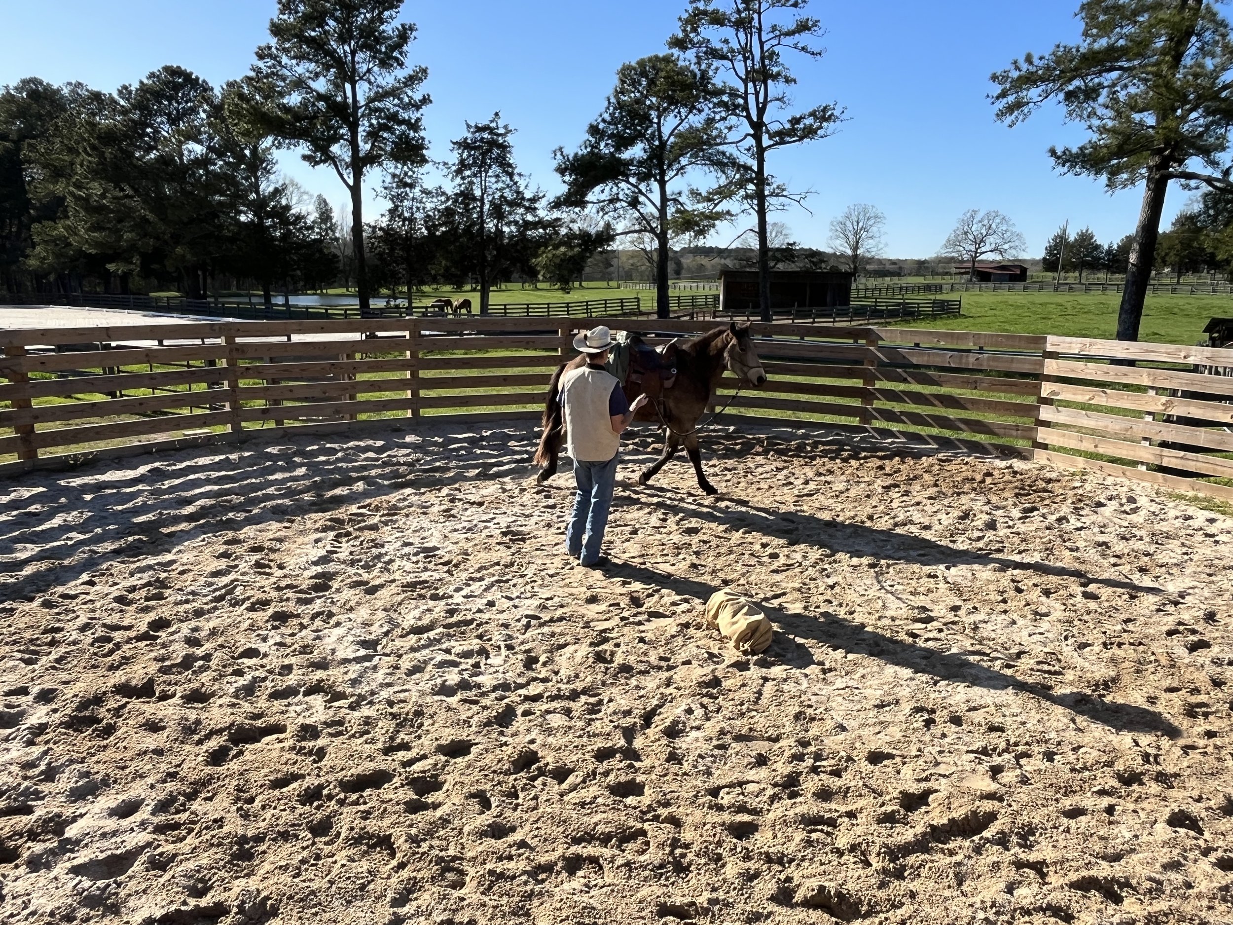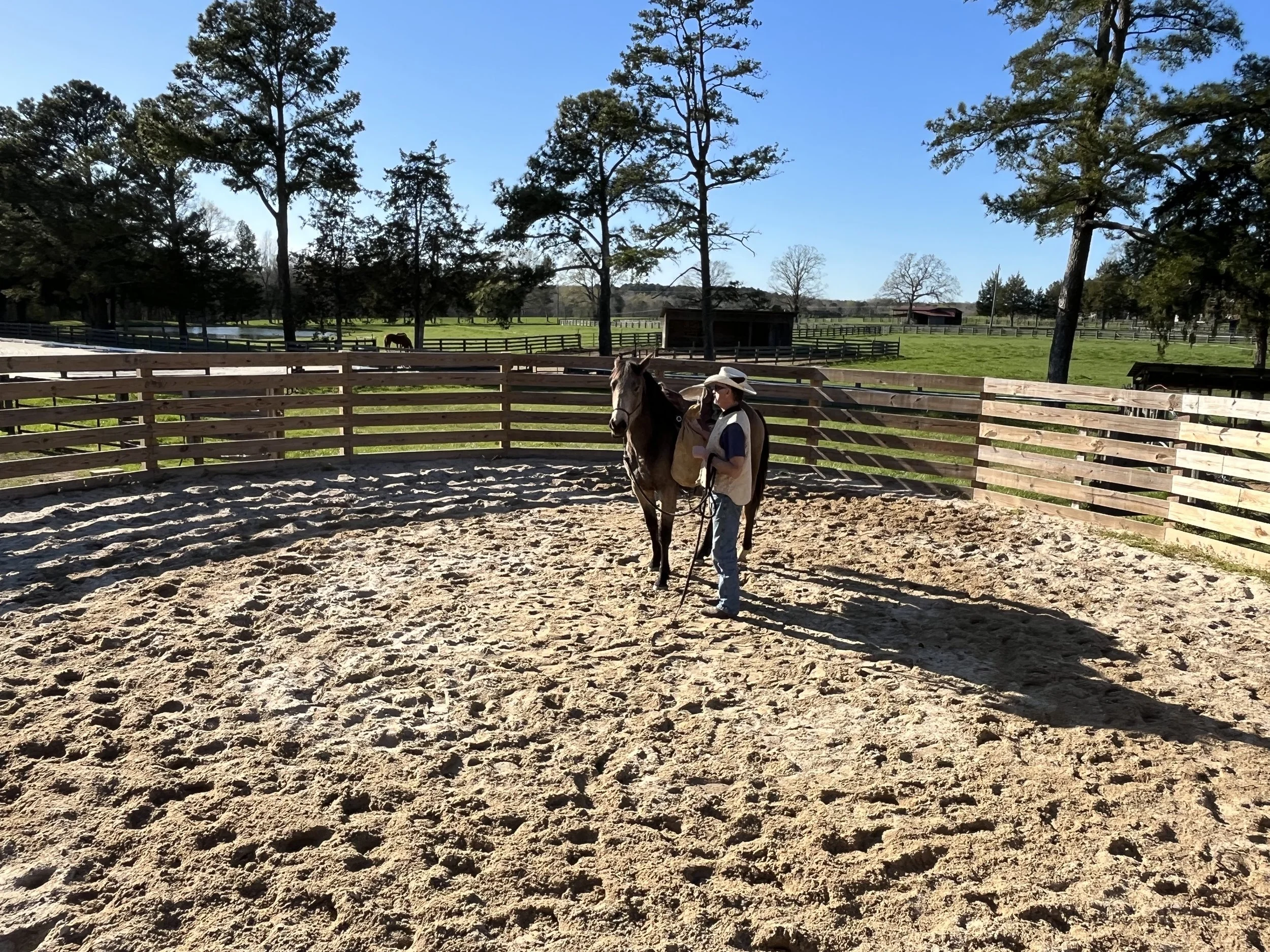 A person in a cowboy hat and vest working with a horse in a fenced outdoor riding arena on a sunny day. Trees and green fields are visible in the background.