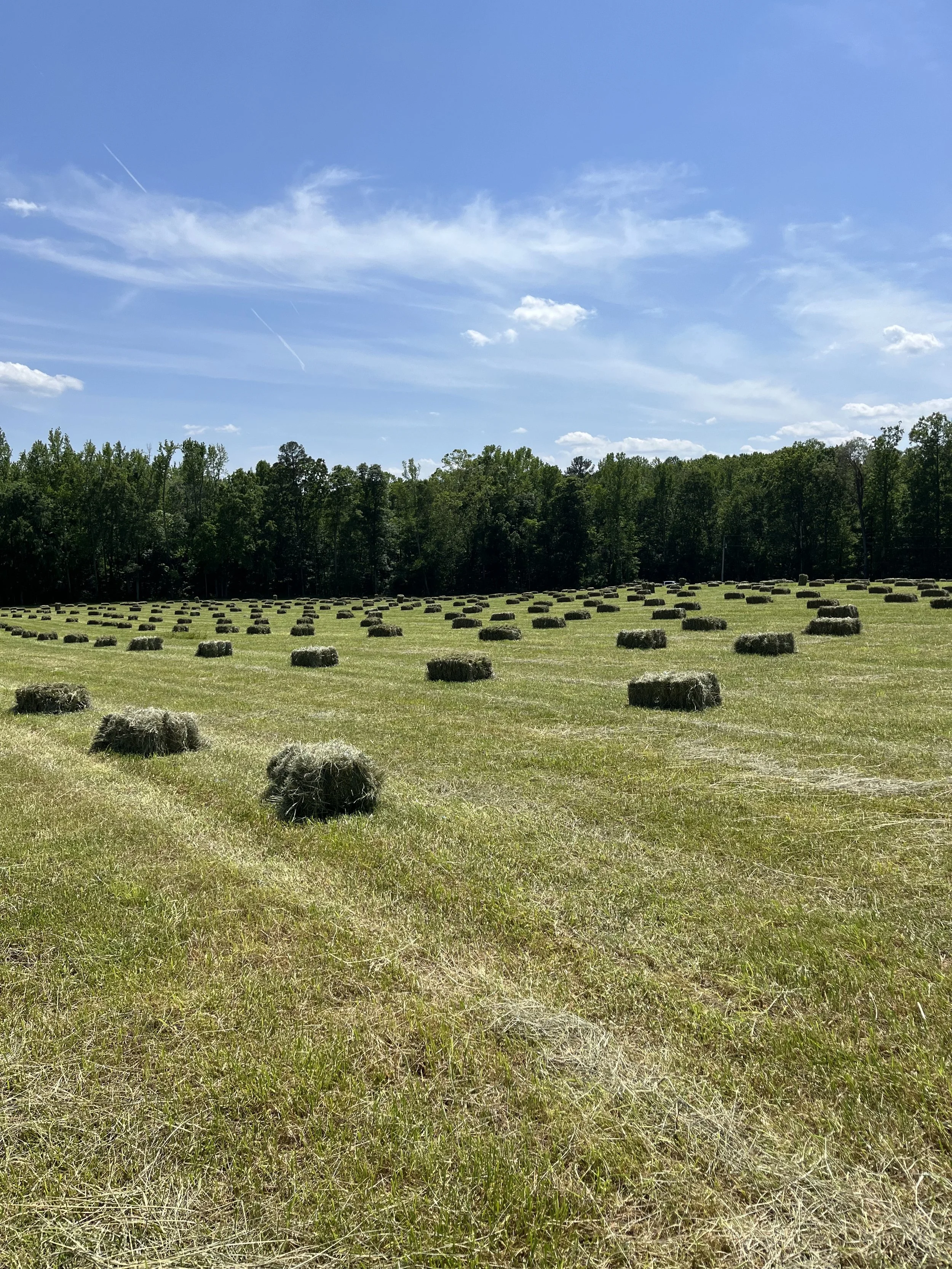 Open field with numerous hay bales and a backdrop of trees under a partly cloudy blue sky.