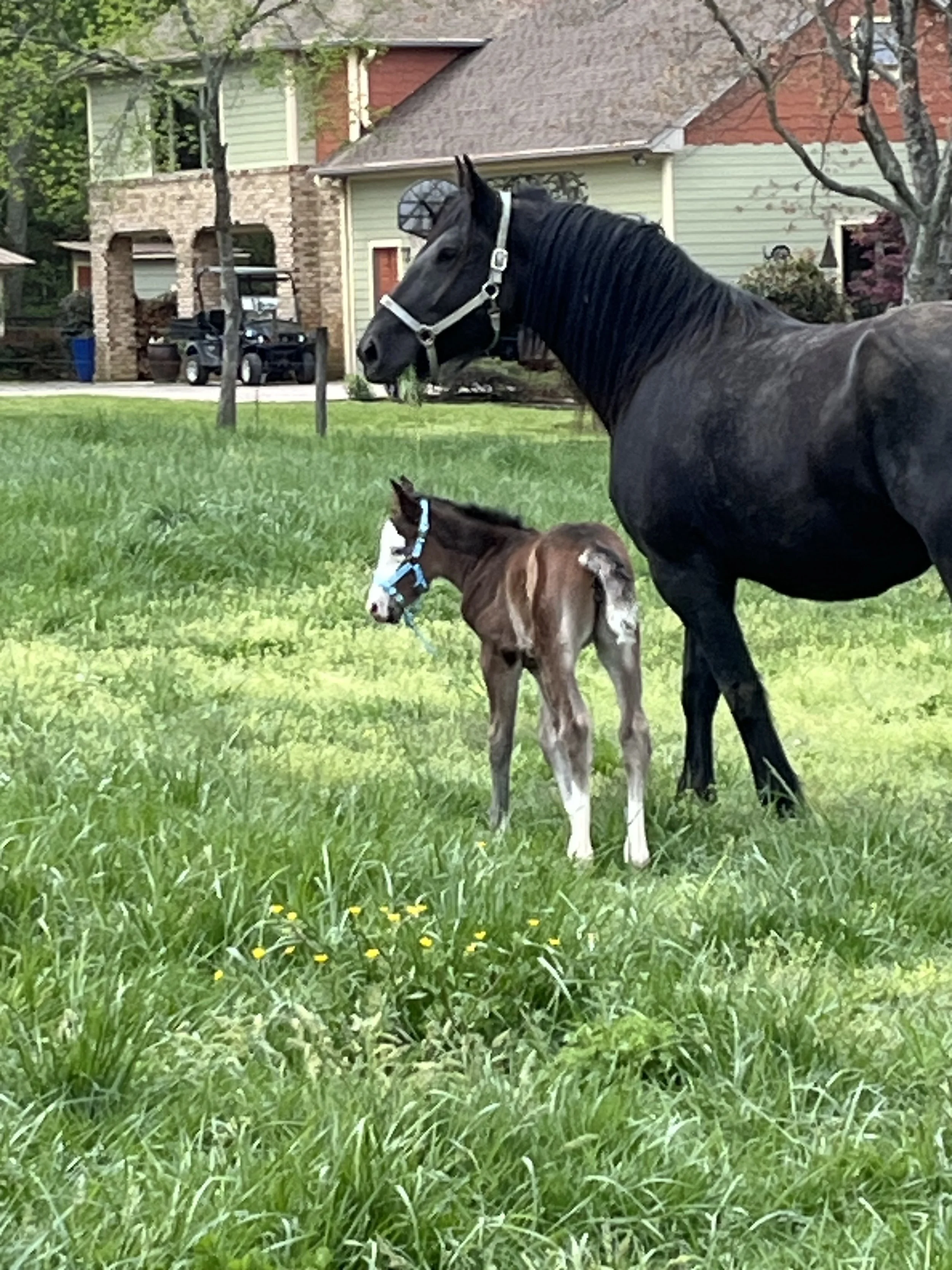 A black adult horse and a brown and white foal standing on a grassy lawn with houses and trees in the background.