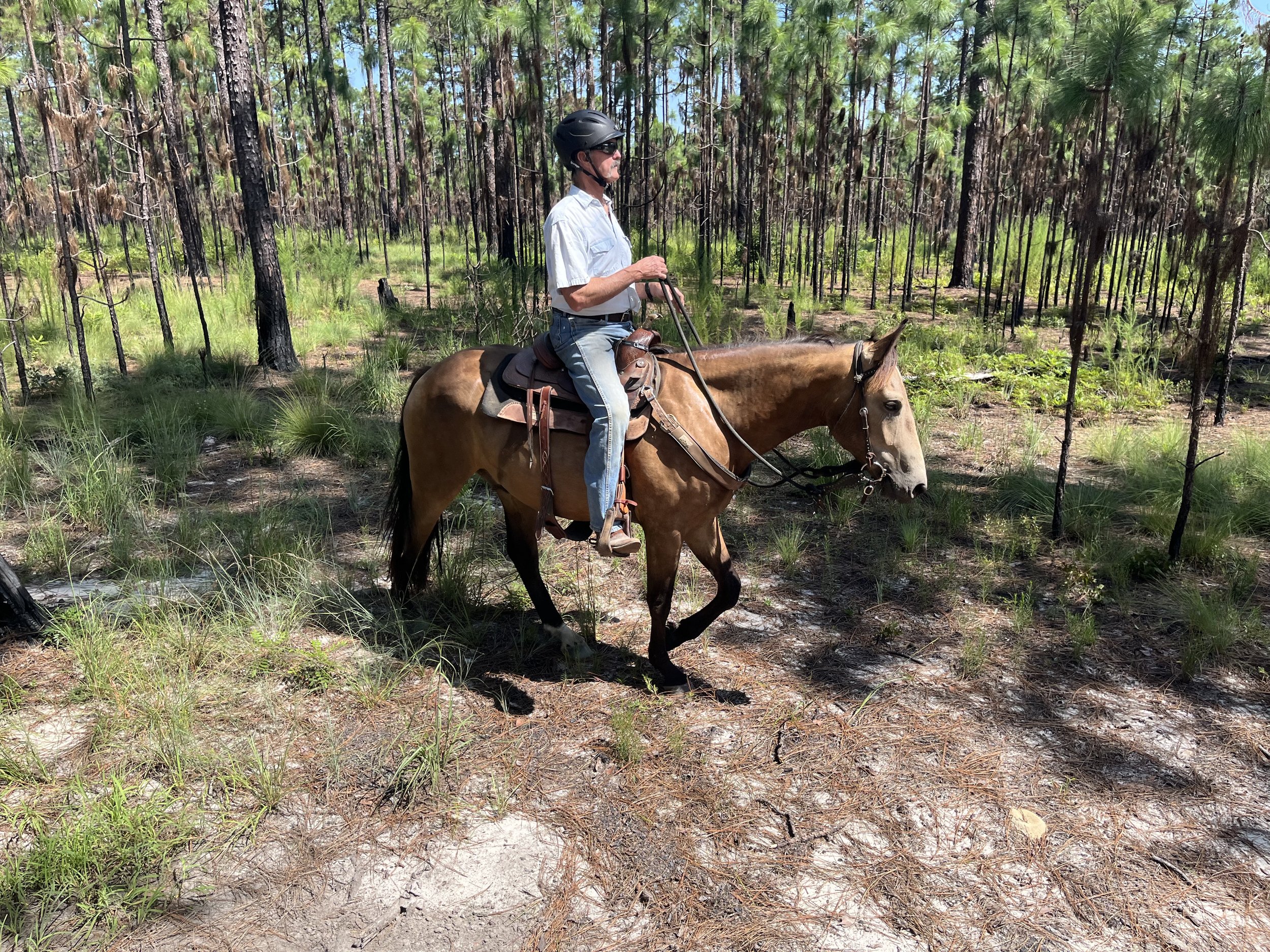 A person riding a horse through a forest with tall trees and green grass, wearing a black helmet, sunglasses, a white shirt, and jeans. View fullsize