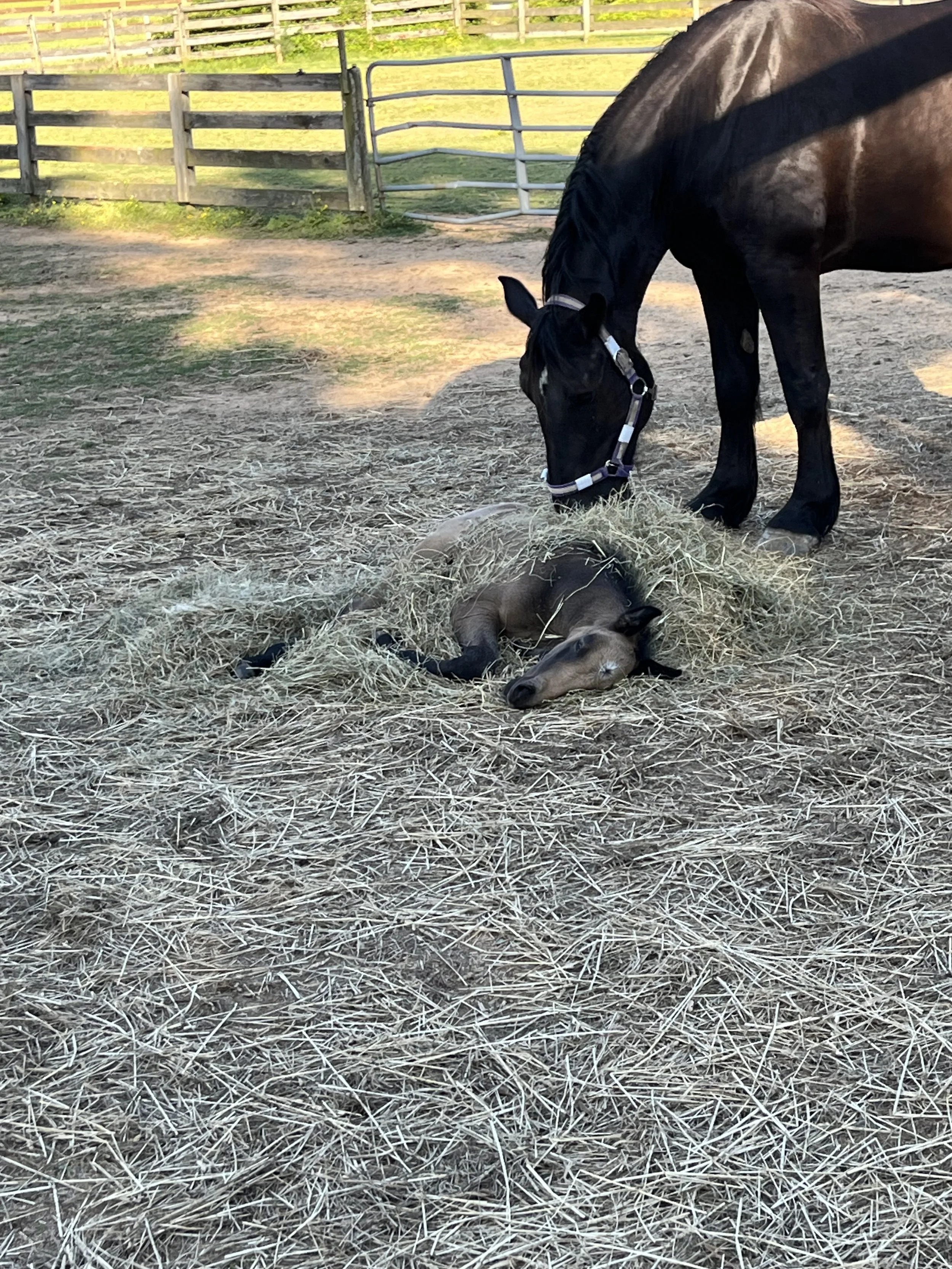 A dark horse is grazing around a small, sleeping foal covered in hay in an outdoor paddock. View fullsize