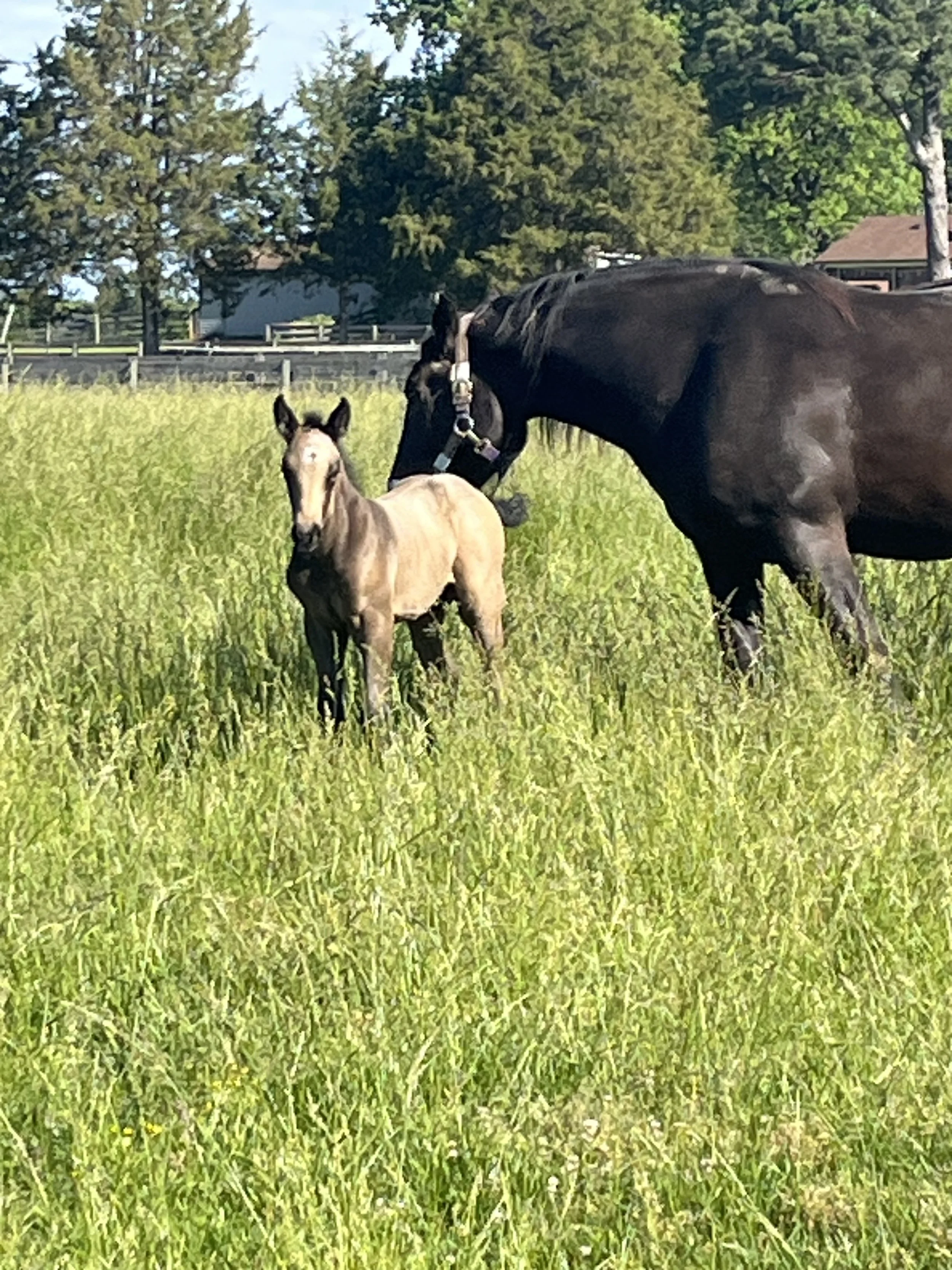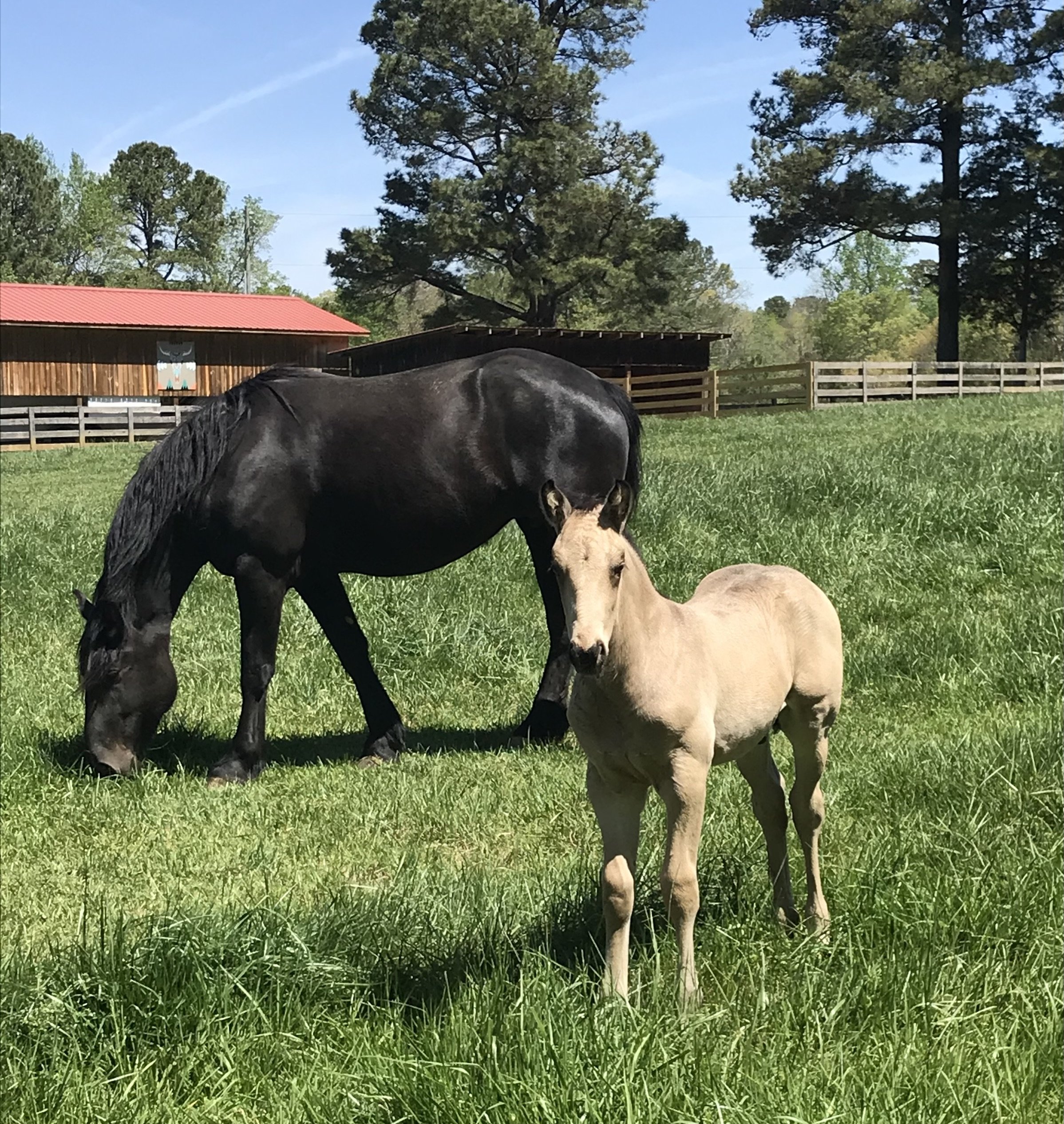 A black adult horse and a light tan foal standing on a grassy field with trees, a wooden fence, and farm buildings in the background on a sunny day.