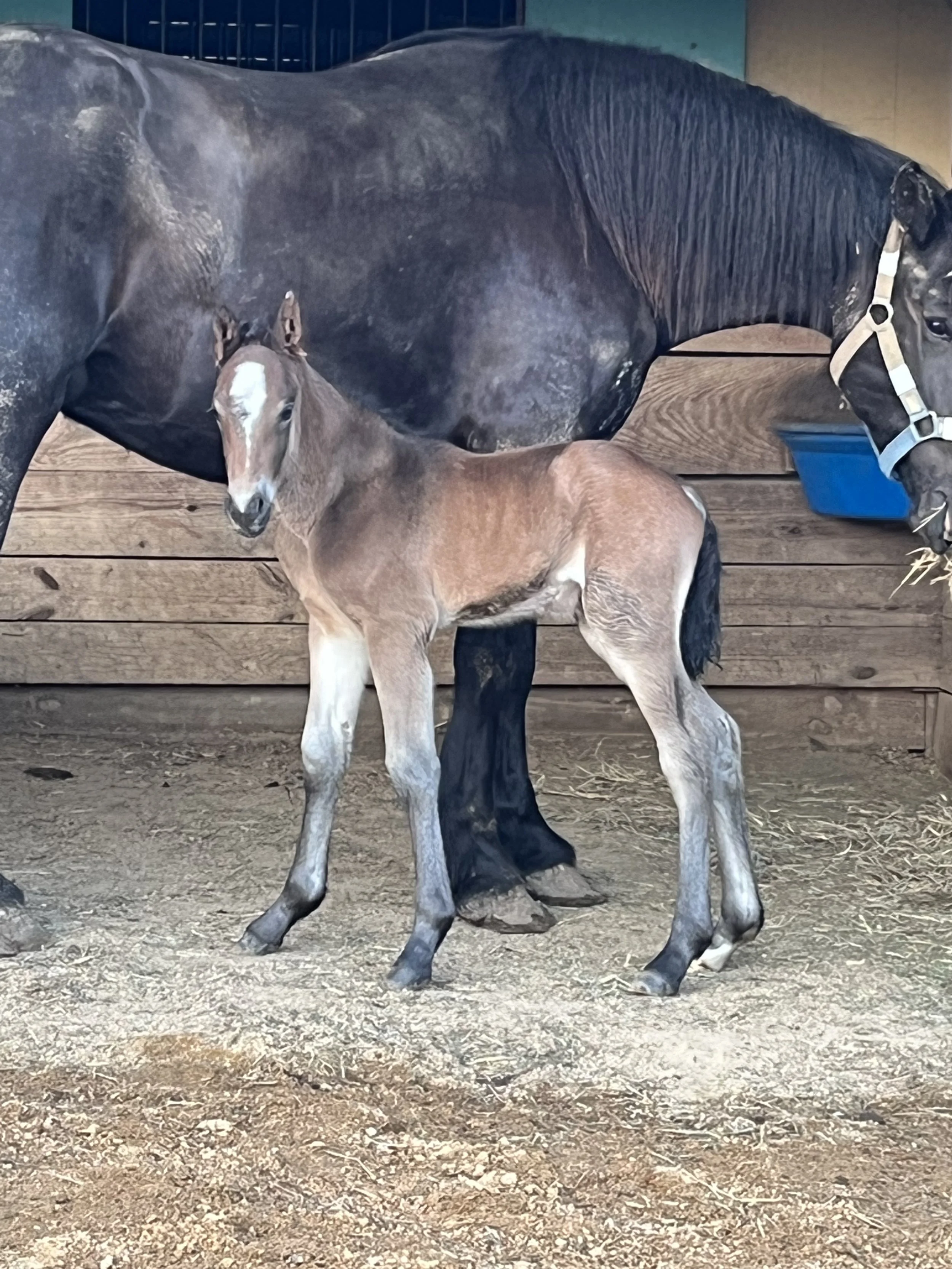 A foal standing next to a mare in a stable; the foal has a light brown coat with a white face marking and dark legs, while the mare has a dark coat and is eating hay.