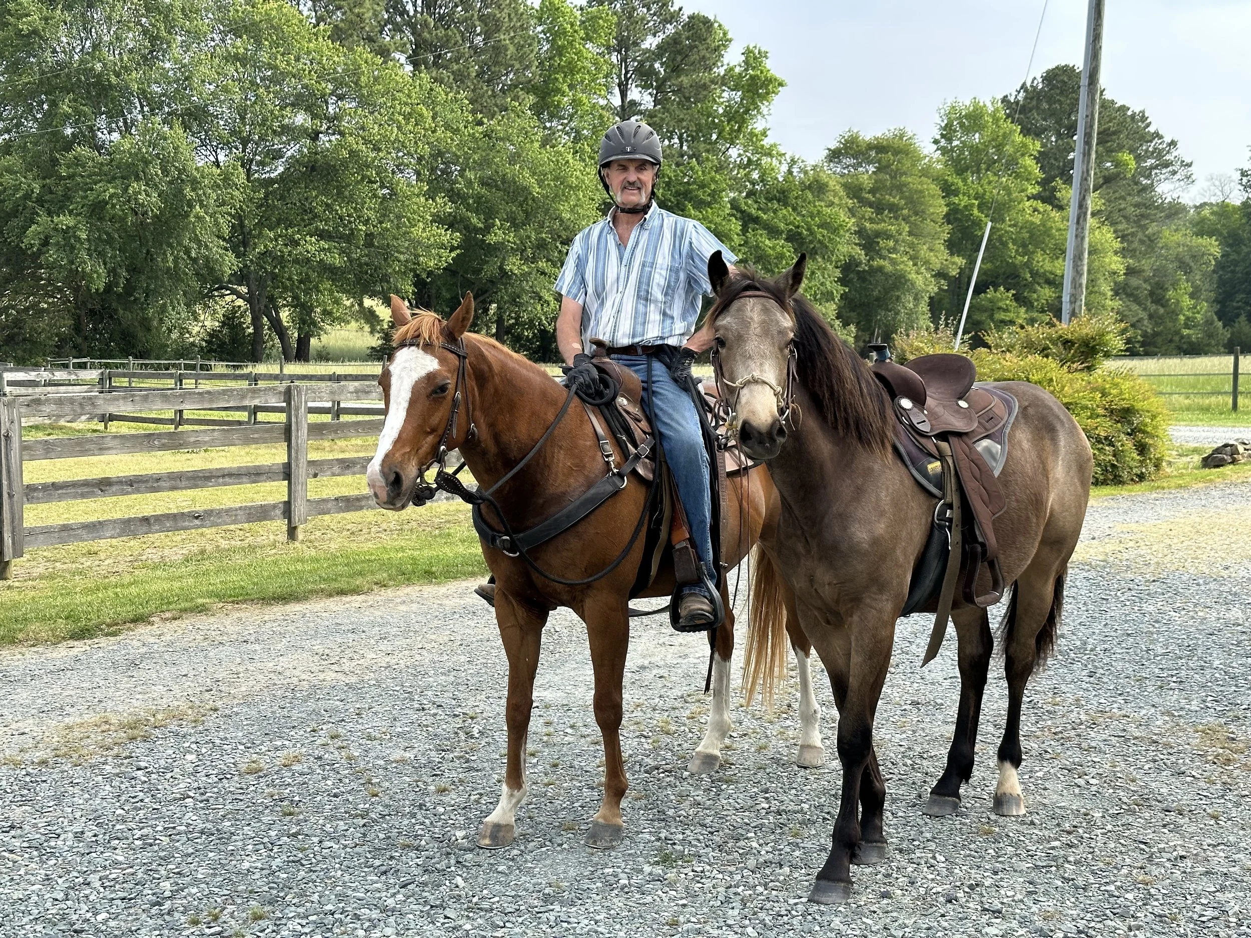 A man wearing a striped shirt and helmet riding a chestnut horse with a white blaze and docked tail, standing on a gravel path next to a darker horse with a long mane, in a green outdoor setting with trees and a wooden fence. View fullsize