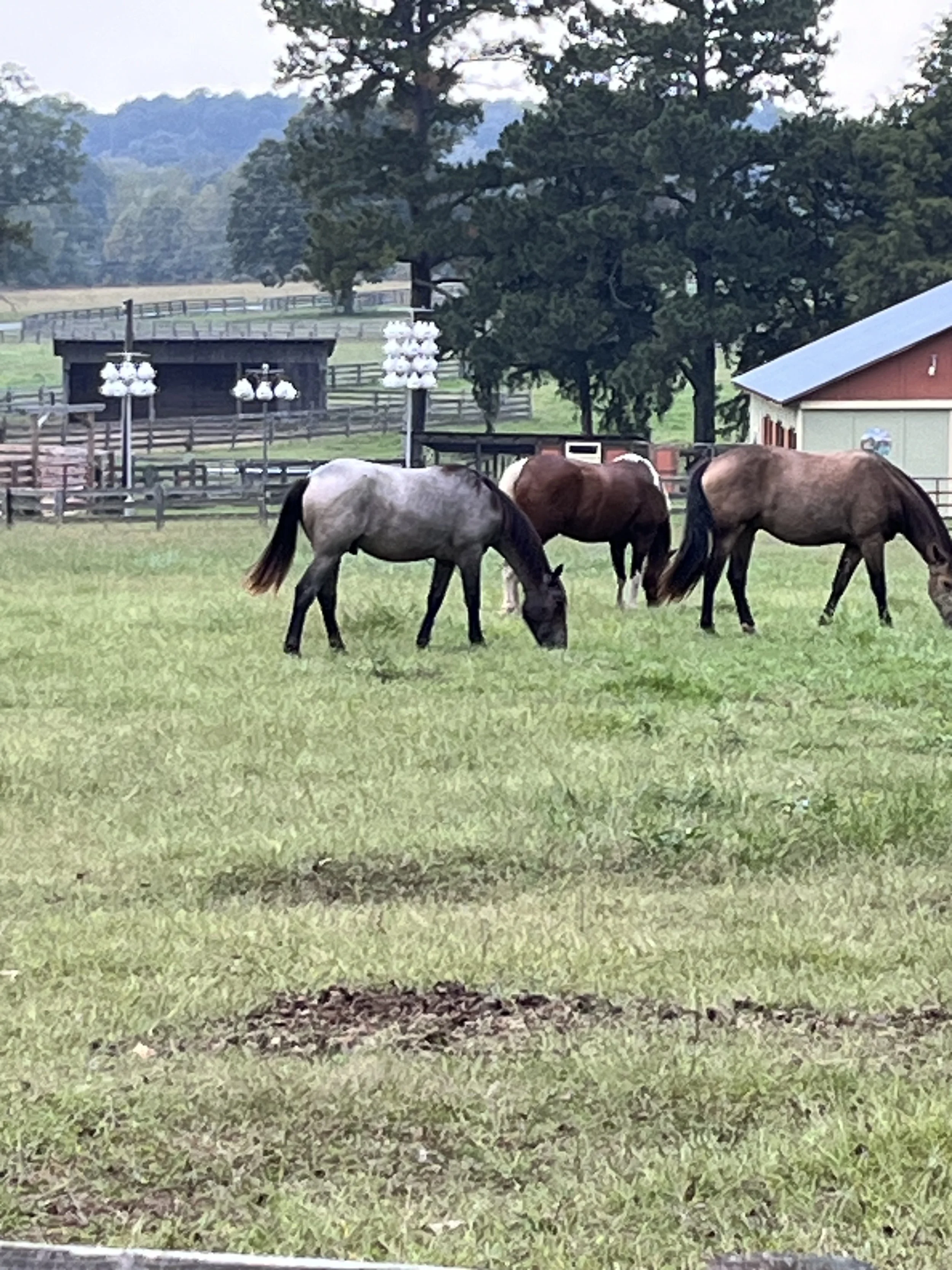 Three horses grazing in a grassy field with trees and farm structures in the background. View fullsize