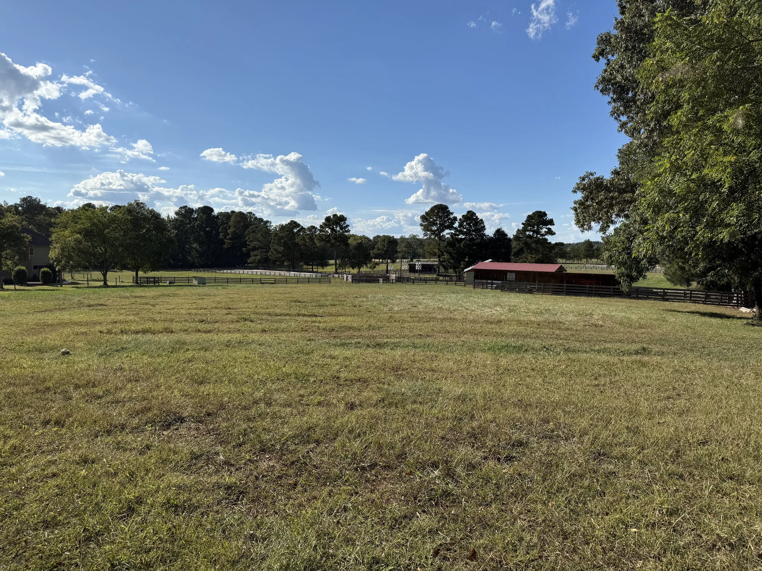 Open grassy field with trees and fenced area under a blue sky with scattered clouds.