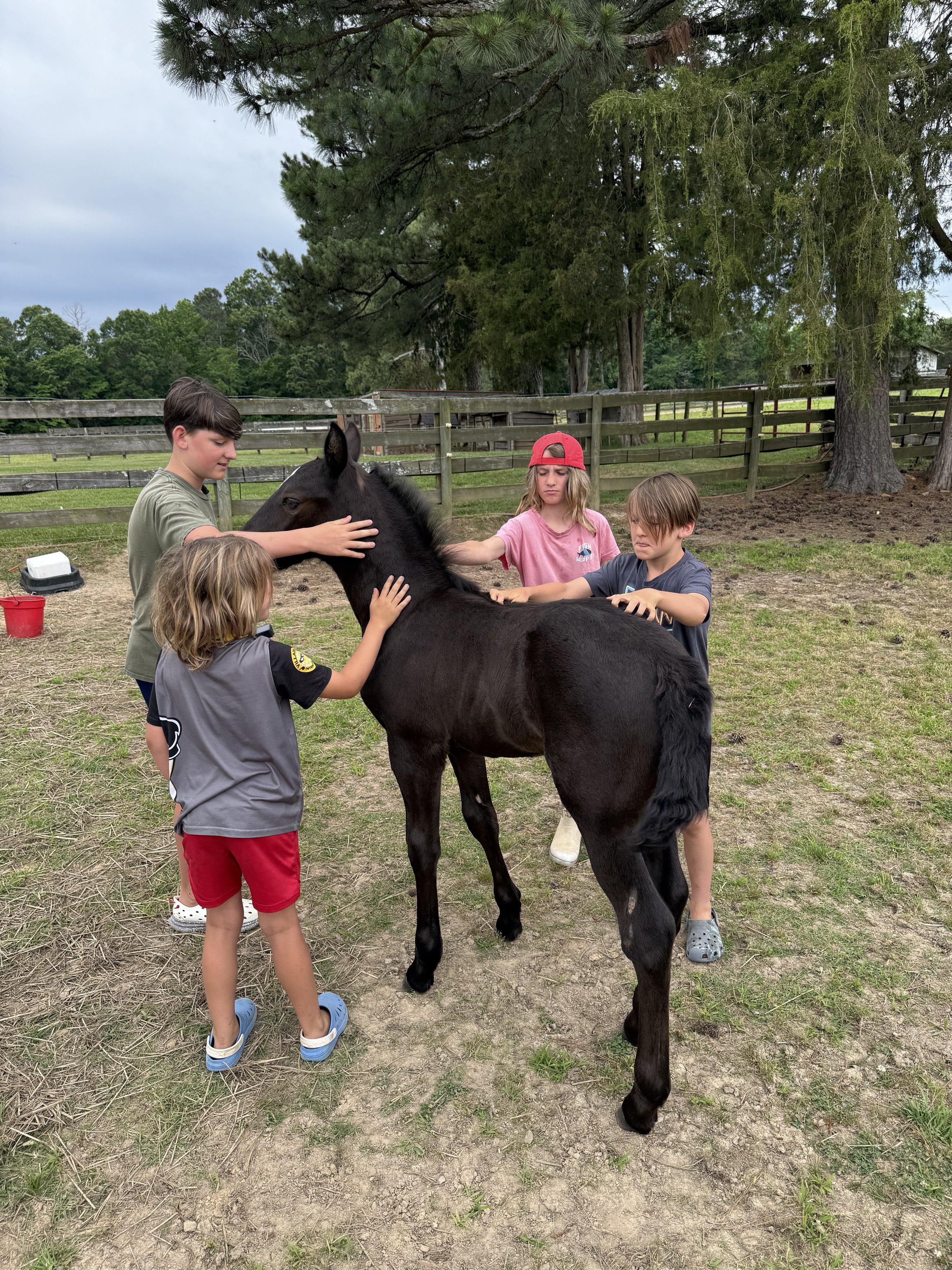 Four children petting a black foal in a grassy outdoor area surrounded by a wooden fence and tall trees. View fullsize