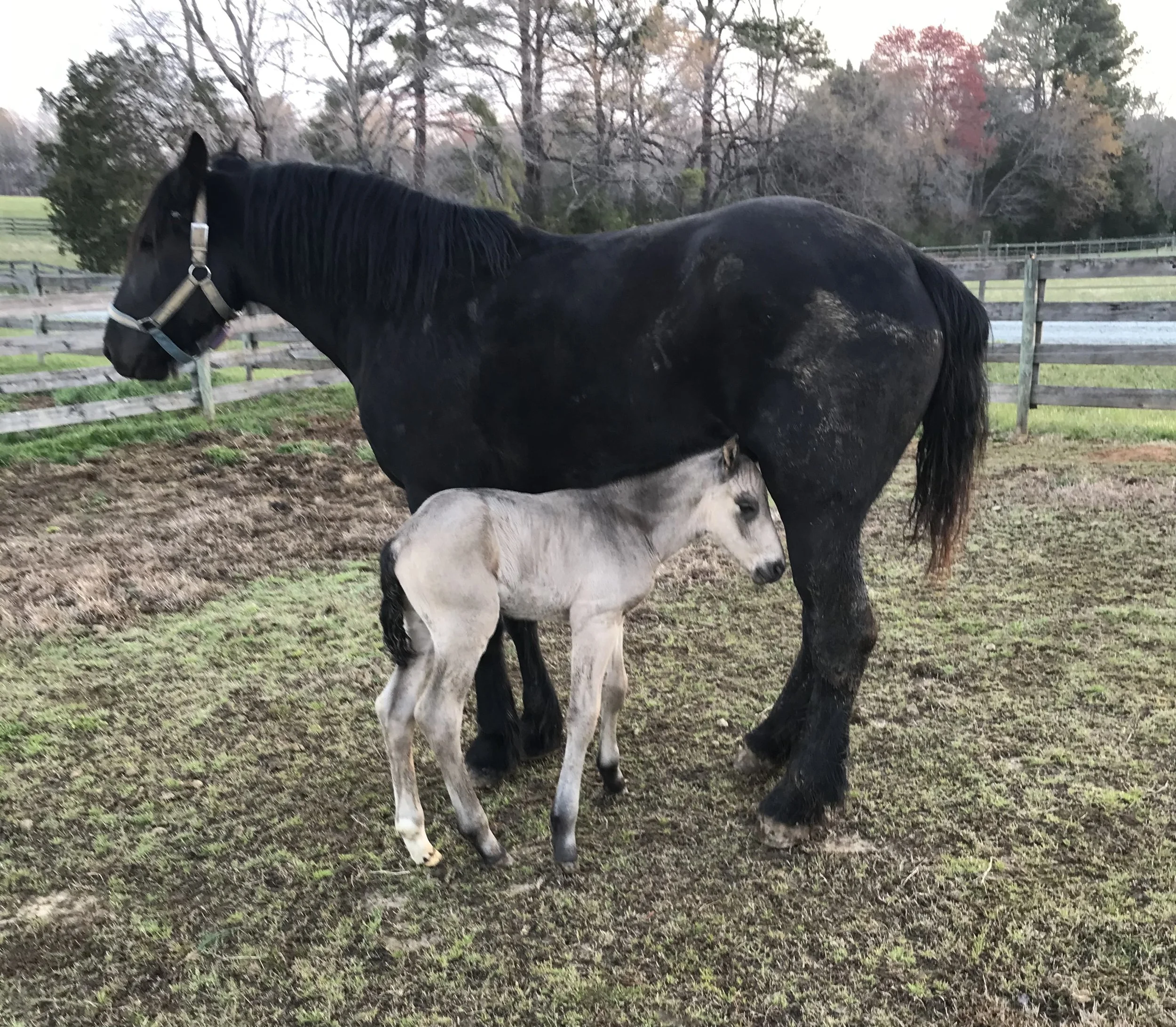 A black adult horse standing in a fenced pasture with a light-colored foal nursing. The background features trees and a partly cloudy sky.