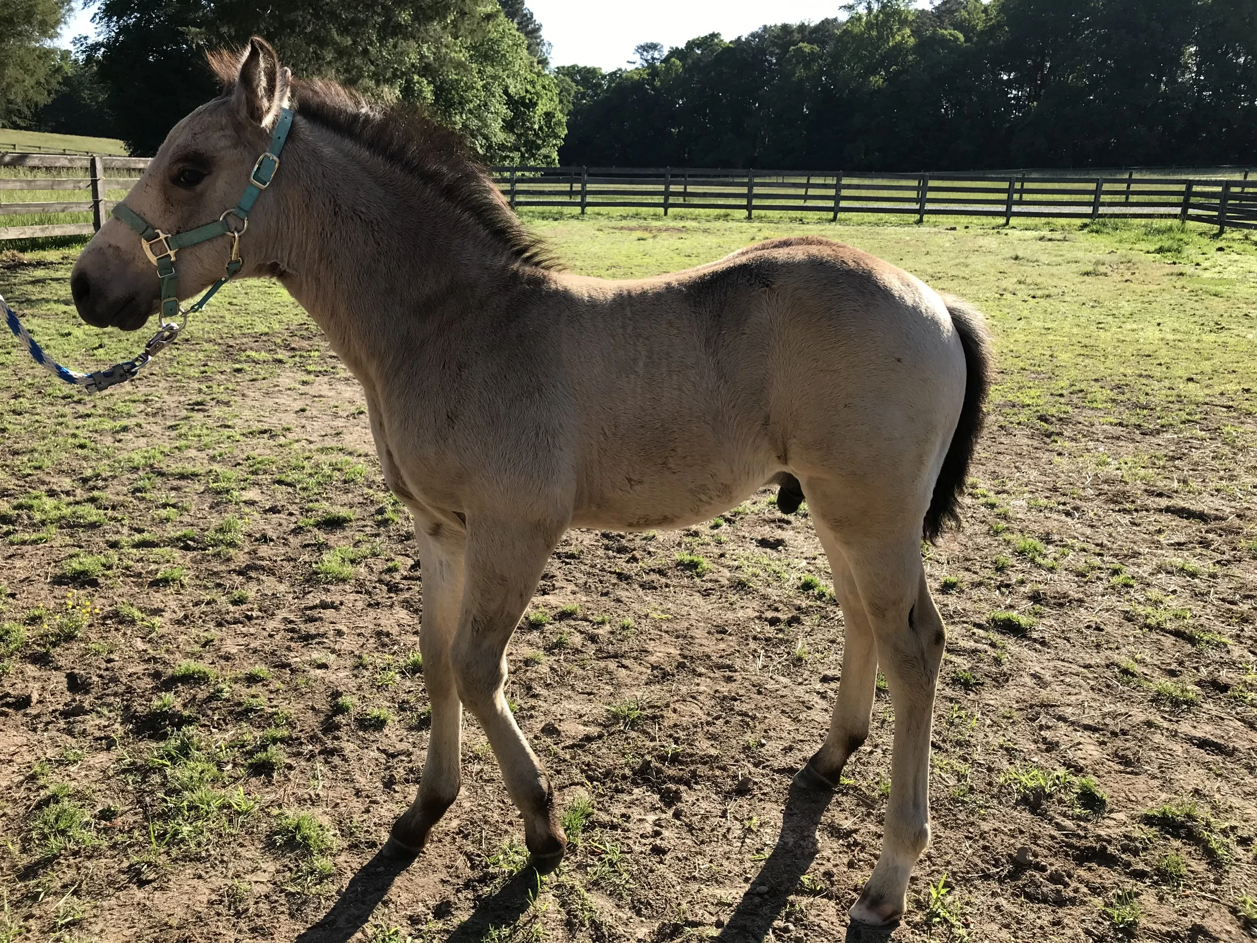 A young light brown foal with a dark mane and tail standing on a patchy grassy field, wearing a blue halter and lead rope. View fullsize