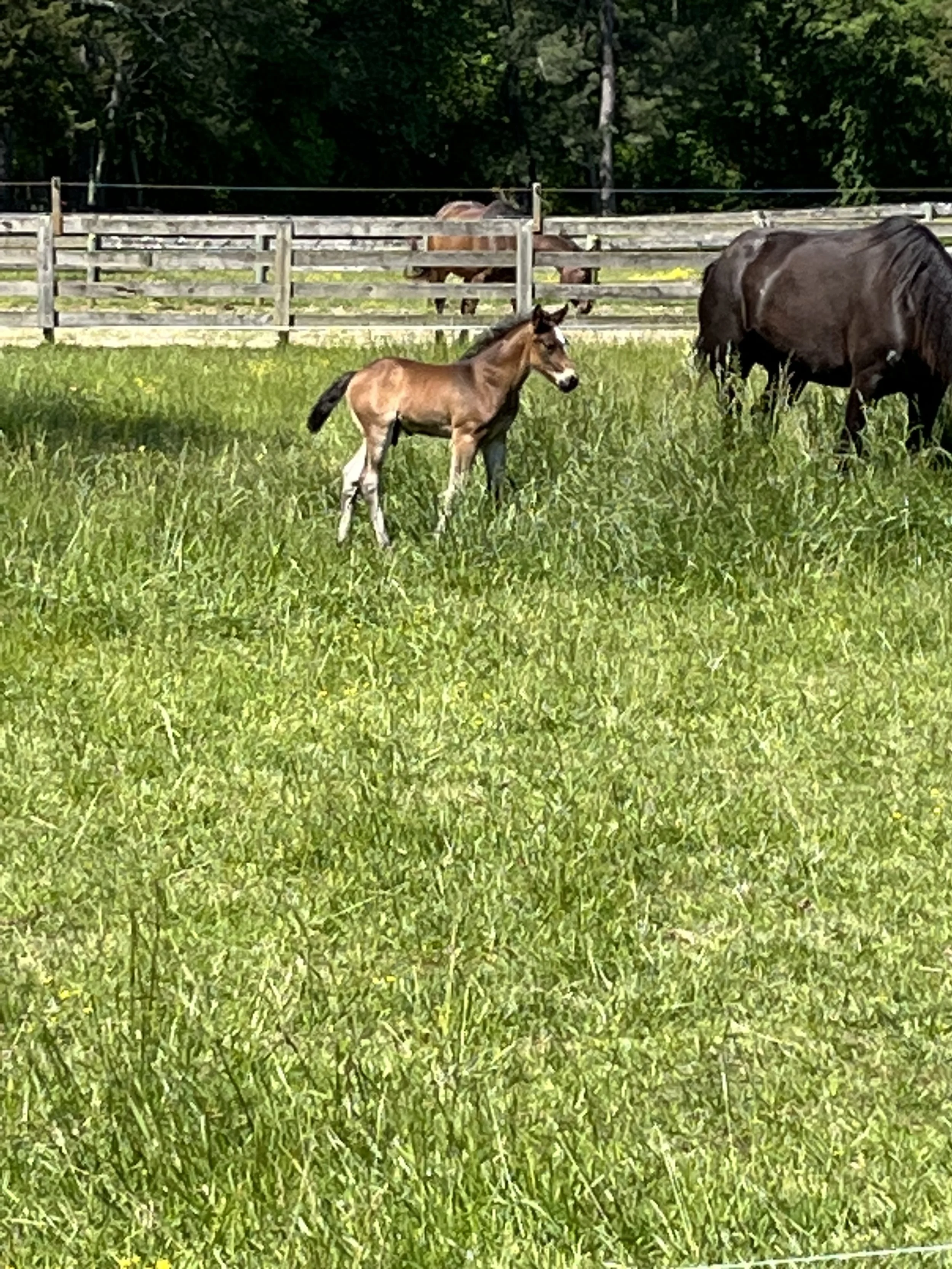 A foal standing in a grassy field with a mare nearby, surrounded by a wooden fence and trees in the background. View fullsize