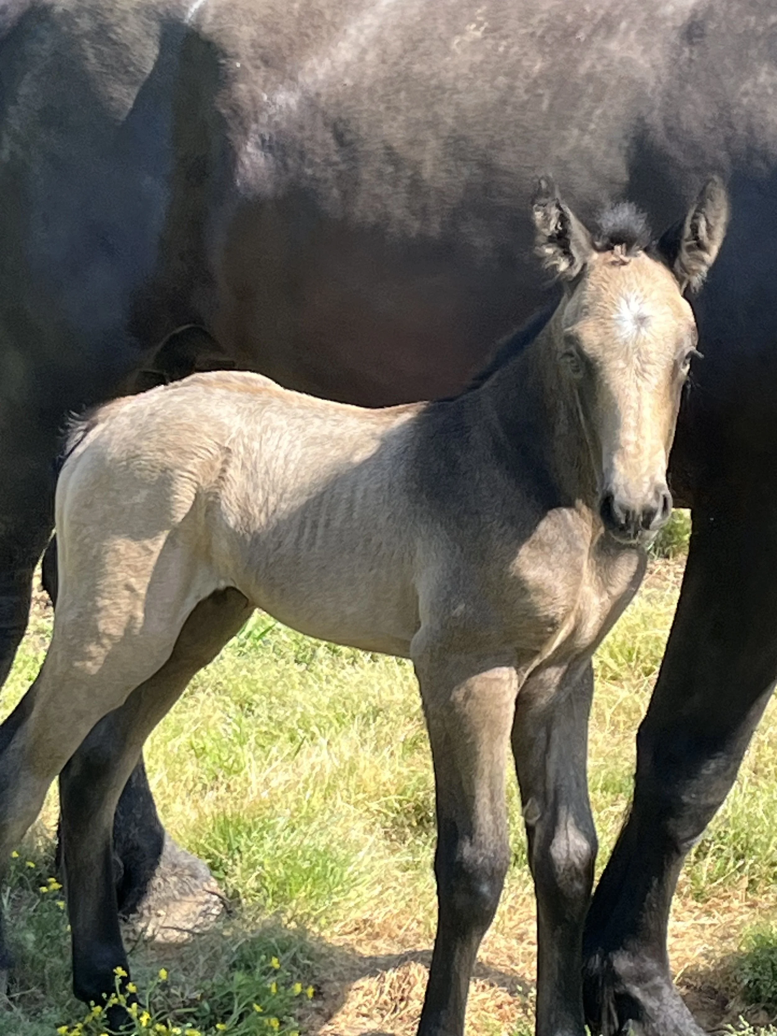 A young foal standing next to an adult horse, with the foal looking directly at the camera.