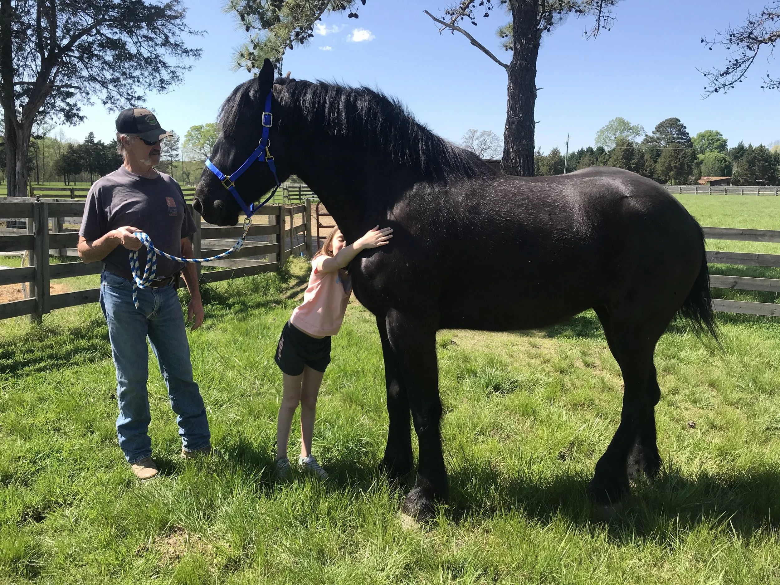A young girl hugging a large black horse while an older man holding a lead rope watches on, in a grassy field with trees and a wooden fence in the background. View fullsize