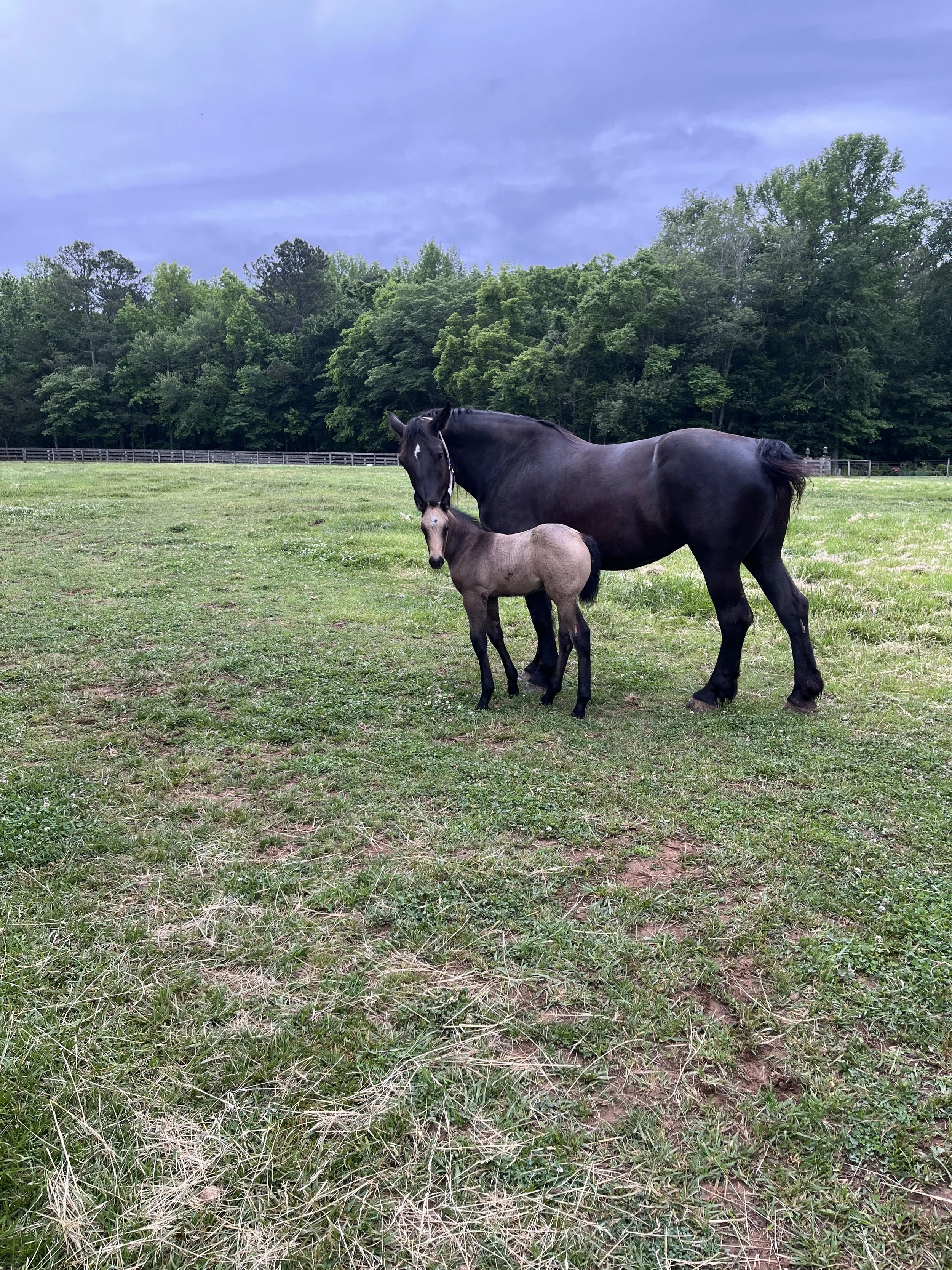 A black adult horse and a brown and white foal standing in a grassy field with trees and a wooden fence in the background.
