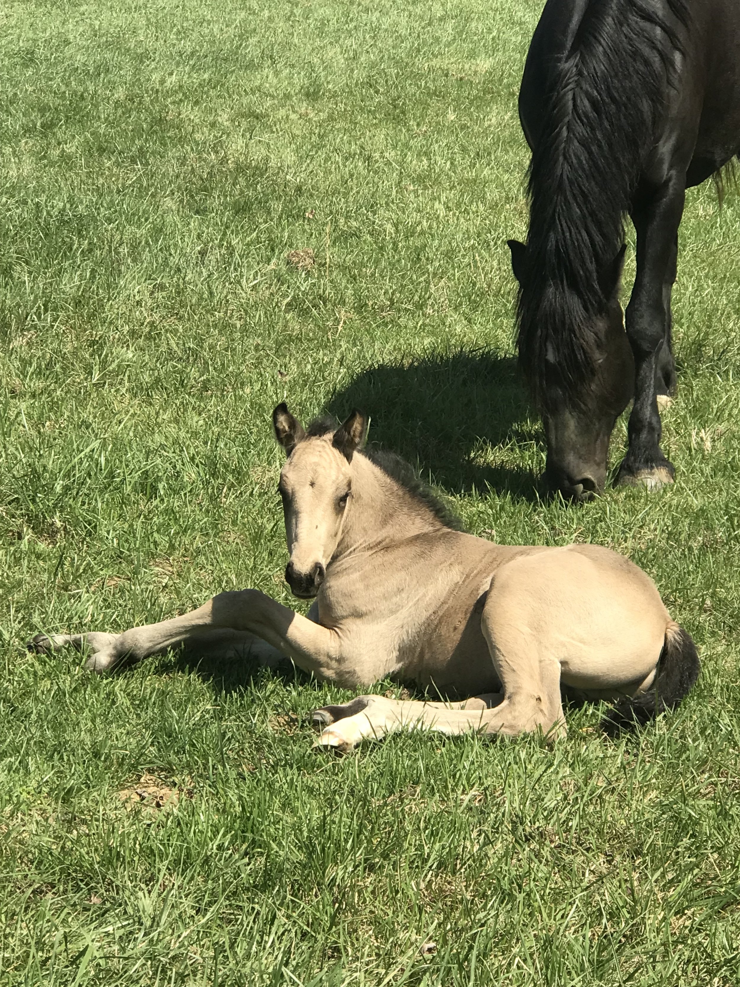A young foal lying down on lush green grass with a black adult horse grazing in the background.