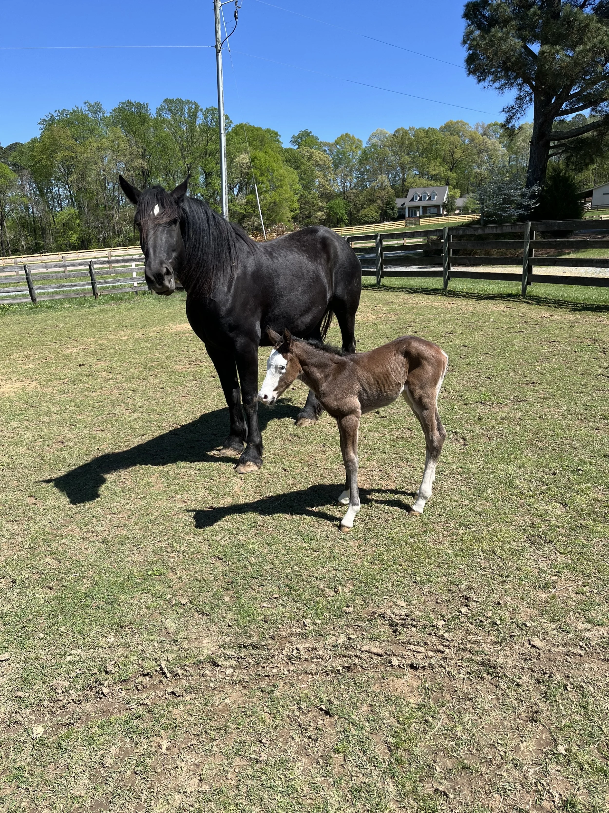 A black adult horse and a brown and white foal standing in a grassy paddock with a wooden fence and trees in the background.