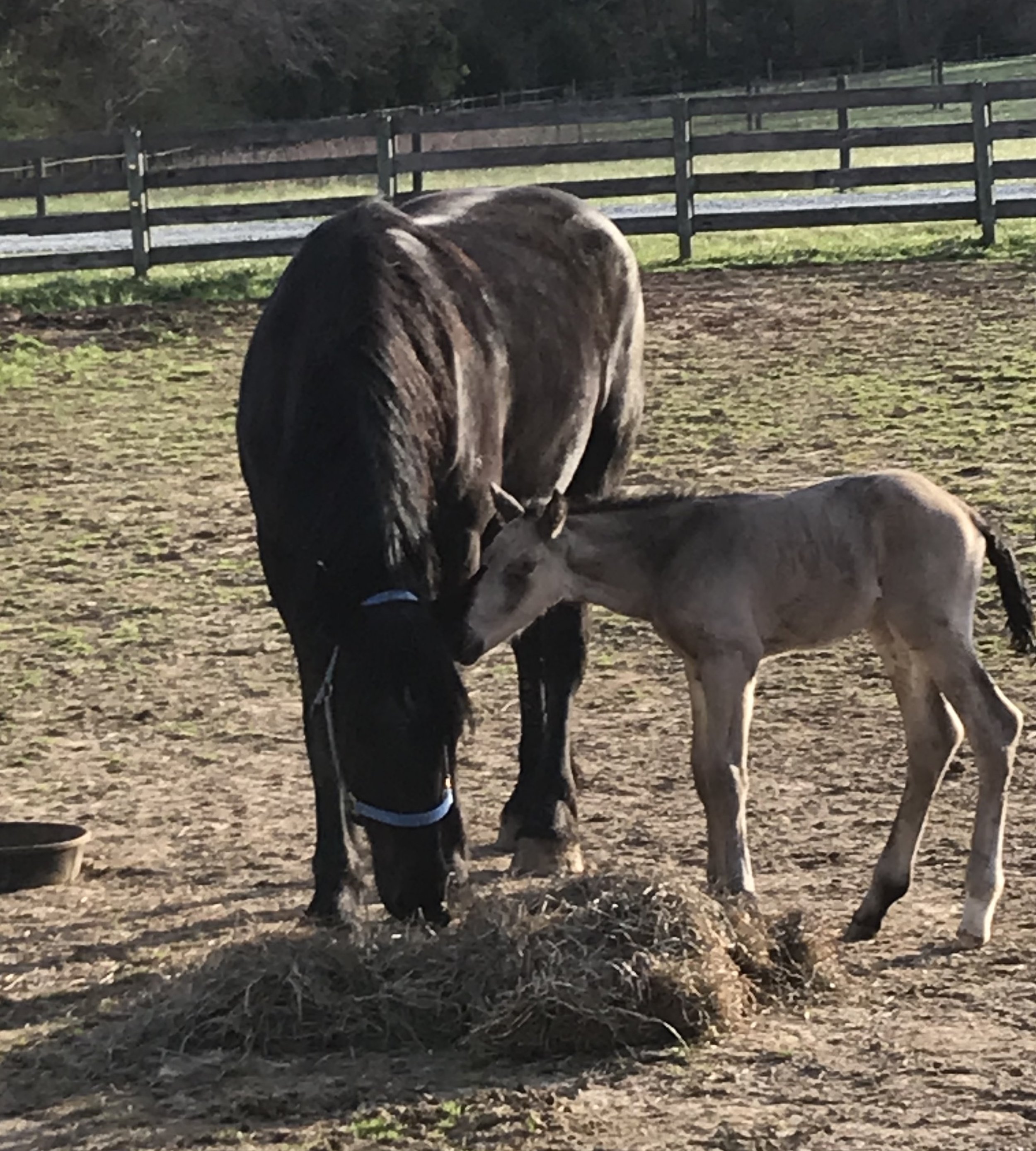 A black horse and a light brown foal stand close together with their heads down near a pile of hay on a dirt field, surrounded by a wooden fence. View fullsize