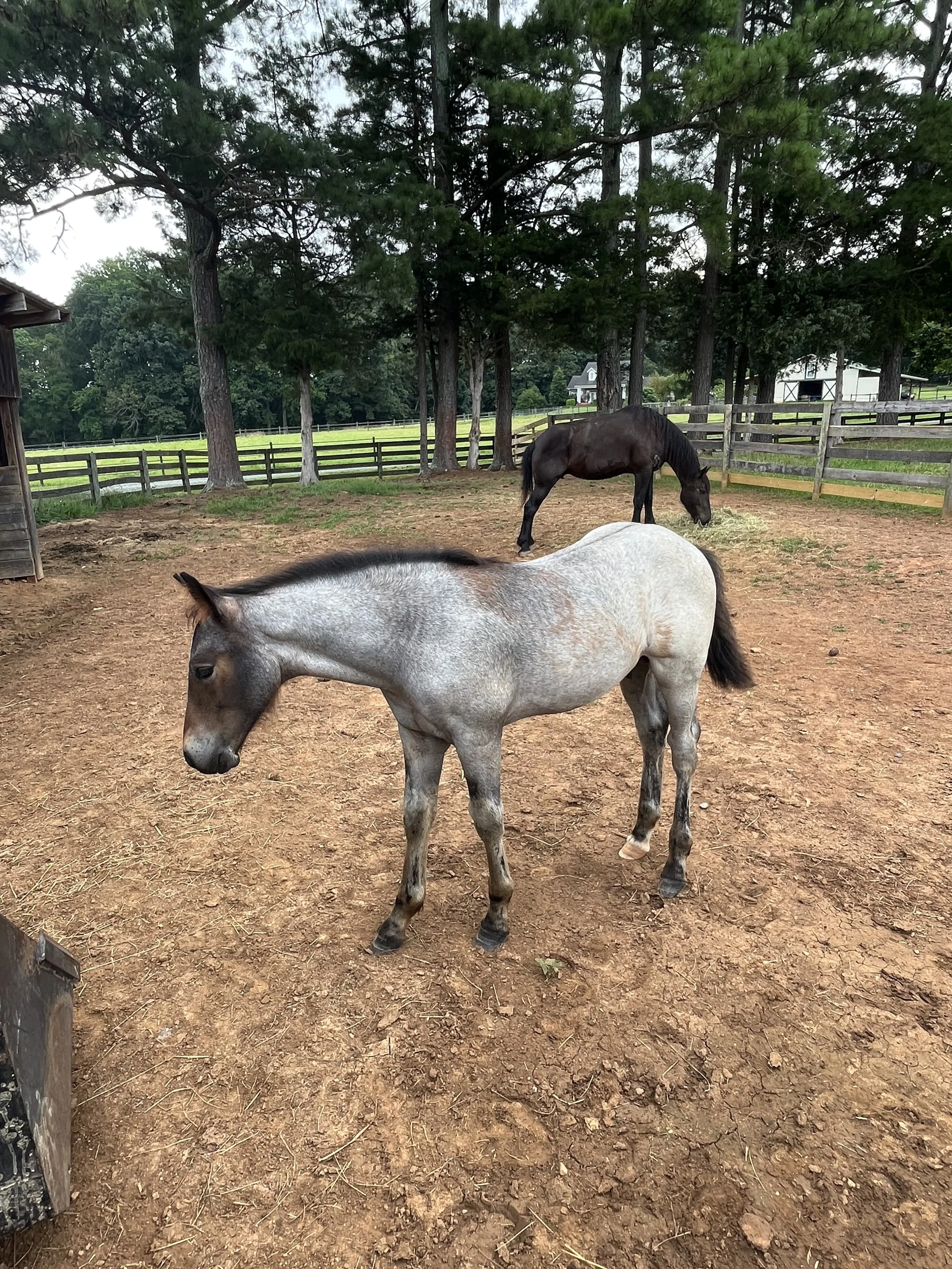 A small gray and white foal standing on dirt near a feeding bucket, with a black horse grazing in the background inside a fenced pasture, surrounded by trees and green fields. View fullsize