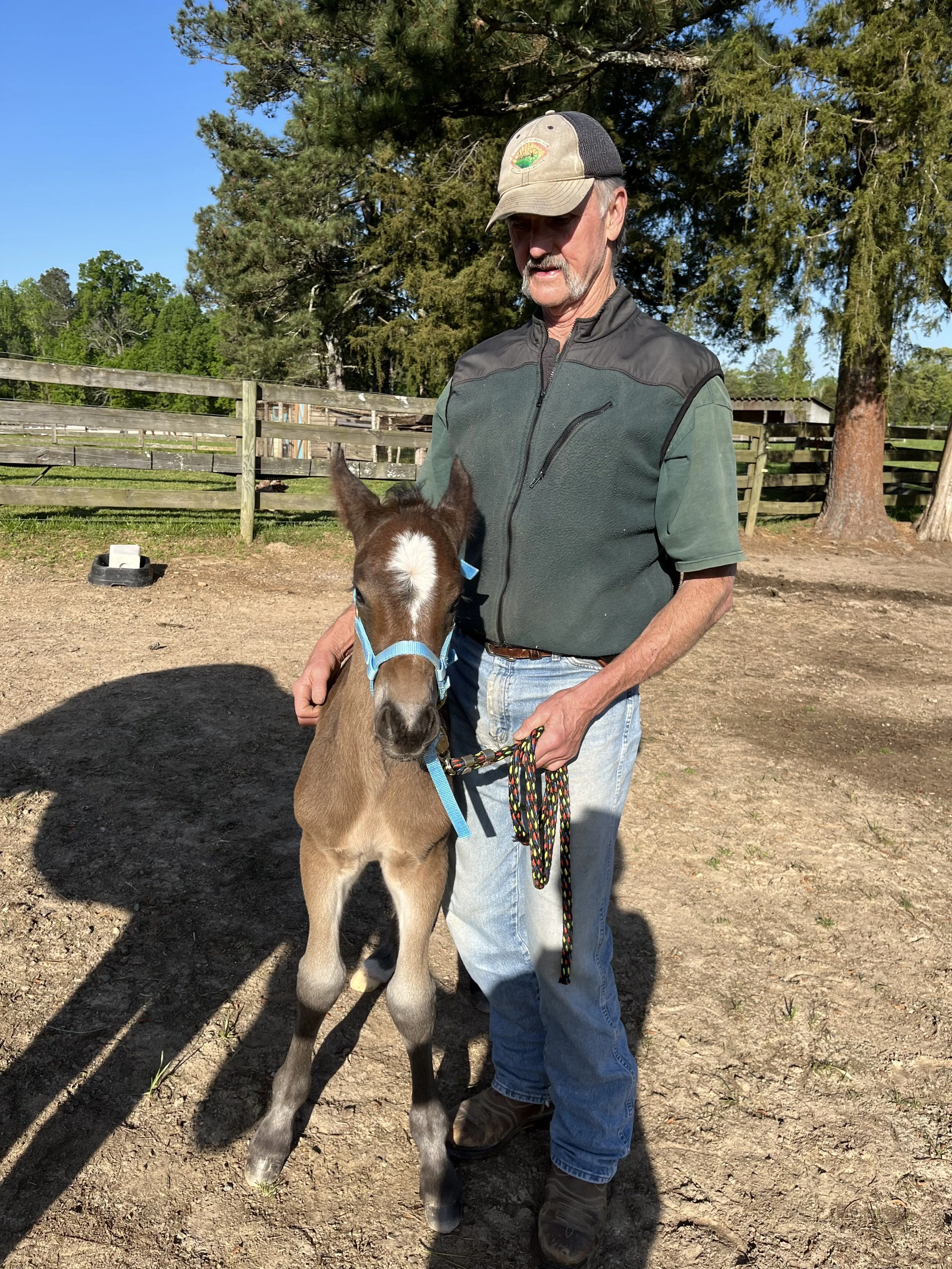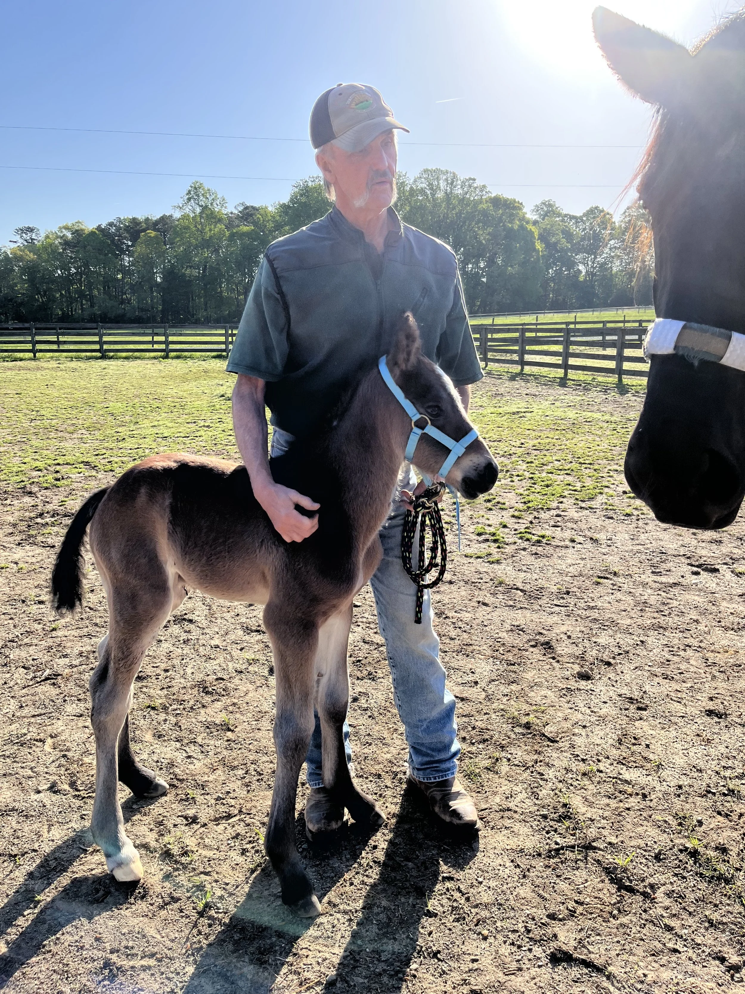 A man with gray hair and a cowboy hat holding a baby foal in a sandy paddock, with another horse's face partially visible on the right. The sun is shining brightly in a clear sky, and there are trees and fencing in the background.