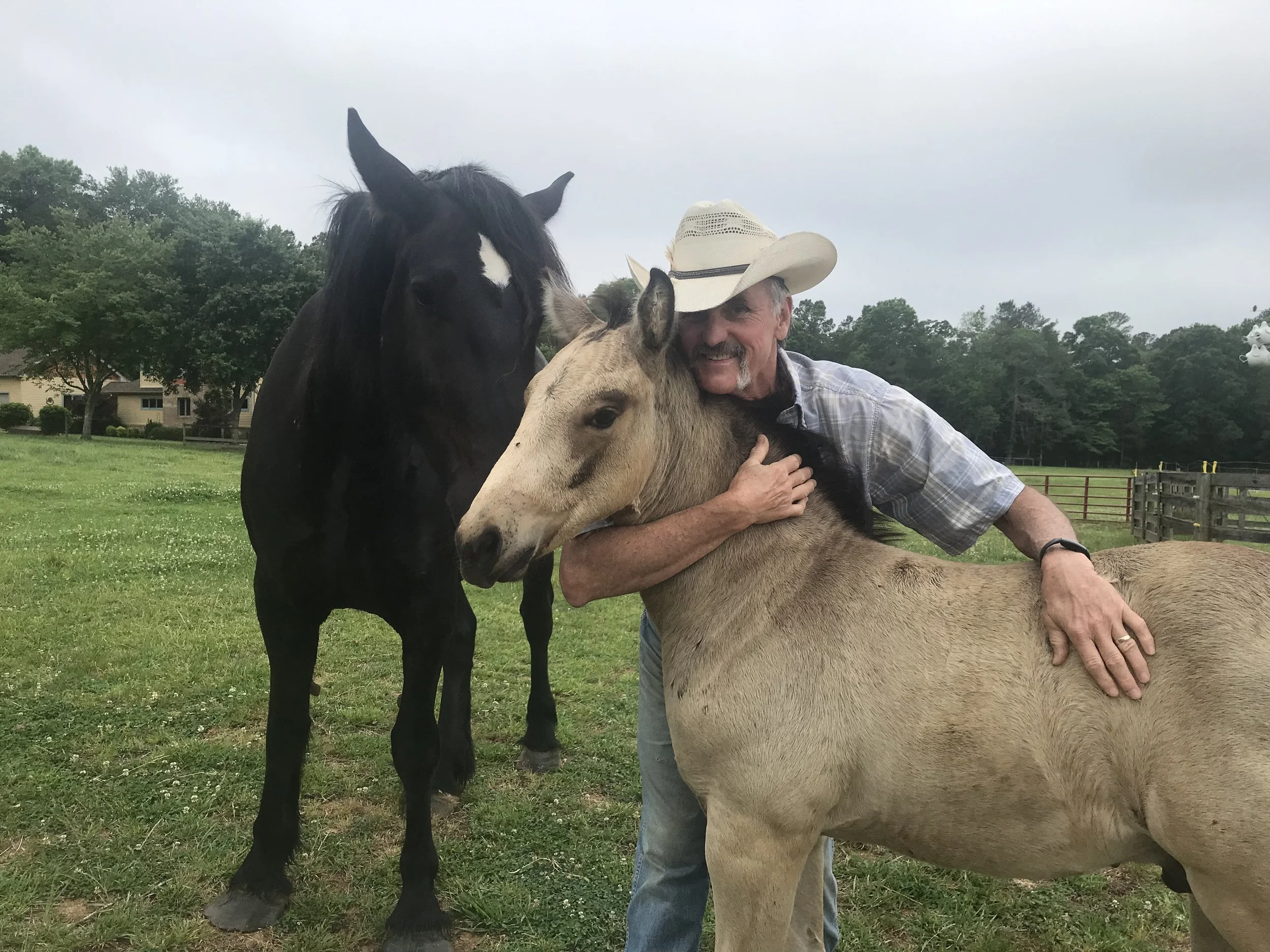 A man wearing a cowboy hat hugging a light brown horse while two other horses, one black with a white mark on its forehead and one dark brown, stand nearby on a grassy field with trees and fenced area in the background. View fullsize