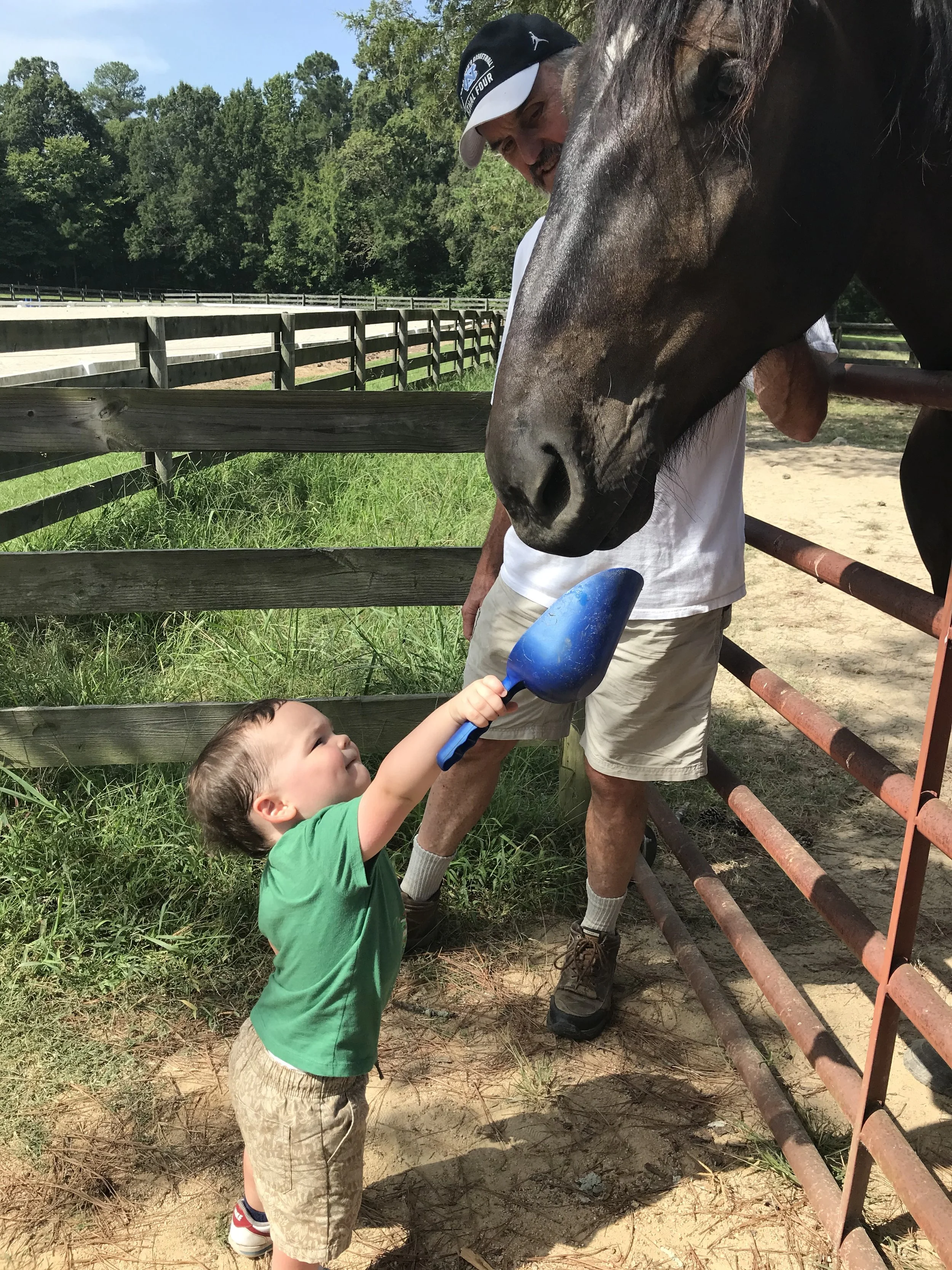 A young boy holding a small blue shovel reaches out to a horse while an older man, possibly his grandfather, stands nearby smiling. They are outdoors at a horse farm or paddock with a wooden fence and green trees in the background.