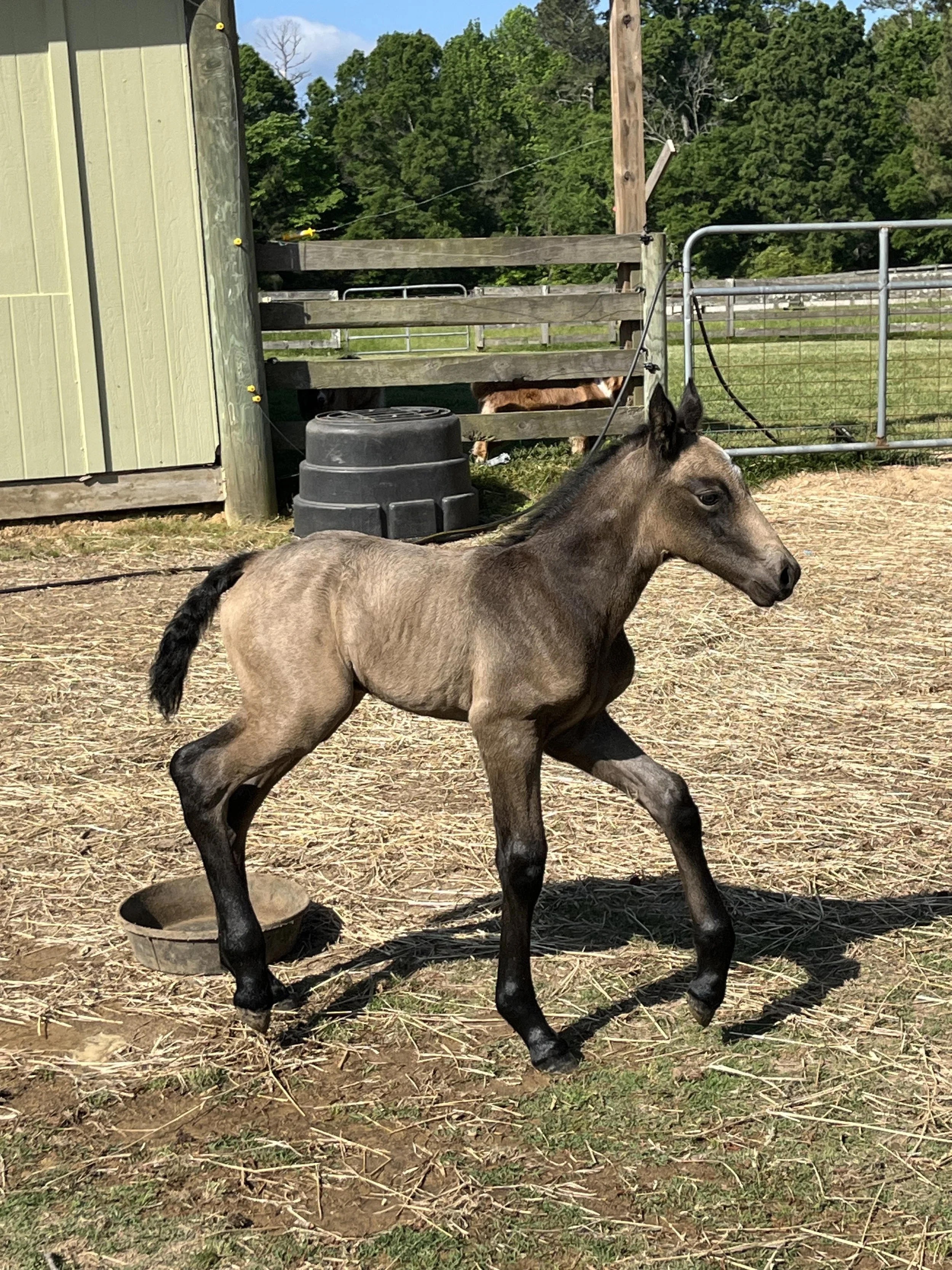 A small gray and white foal standing on dirt near a feeding bucket, with a black horse grazing in the background inside a fenced pasture, surrounded by trees and green fields.