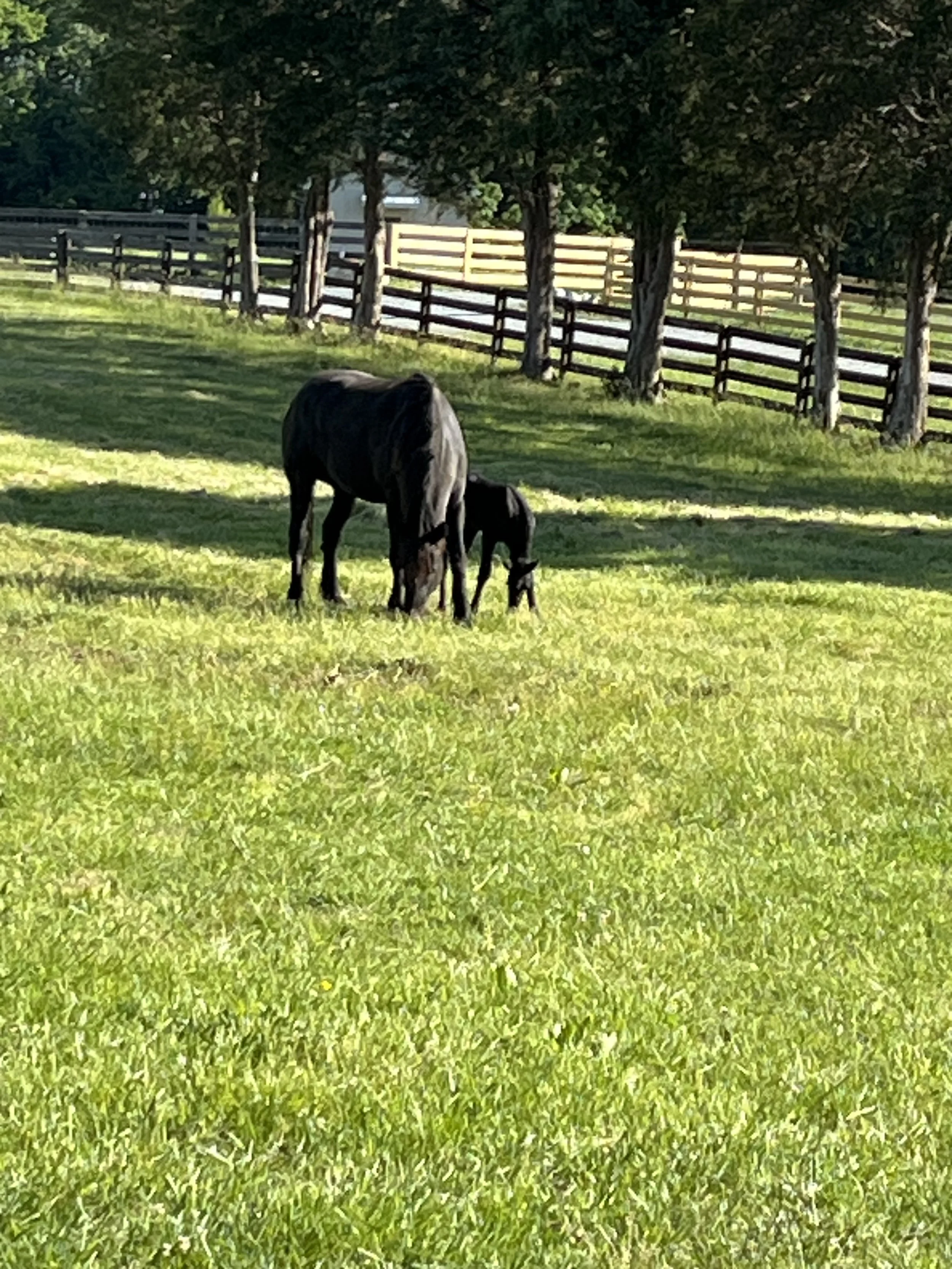 A black adult horse and a light tan foal standing on a grassy field with trees, a wooden fence, and farm buildings in the background on a sunny day. View fullsize