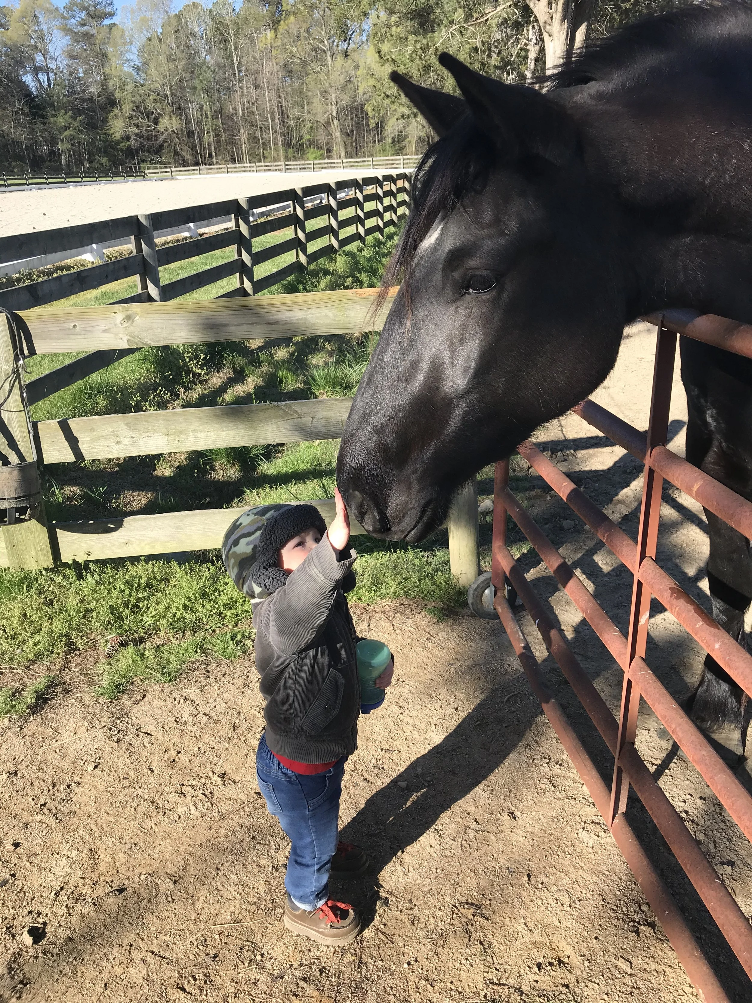 A young child in a gray jacket, jeans, and a camouflage hat reaches out to touch a large black horse through a rusty metal fence at an outdoor farm or petting zoo during daytime. View fullsize