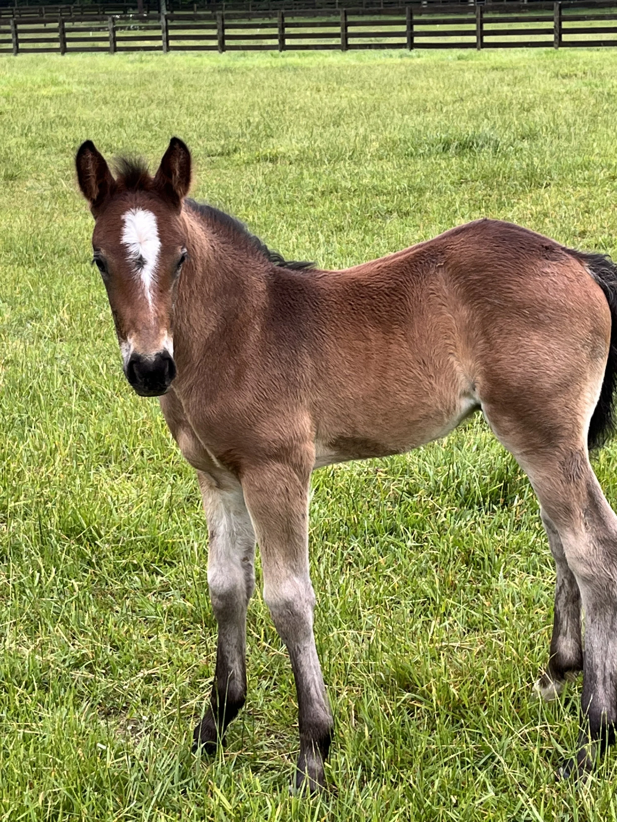 A young brown foal with a white star-shaped marking on its forehead standing in a grassy field with a wooden fence in the background. View fullsize