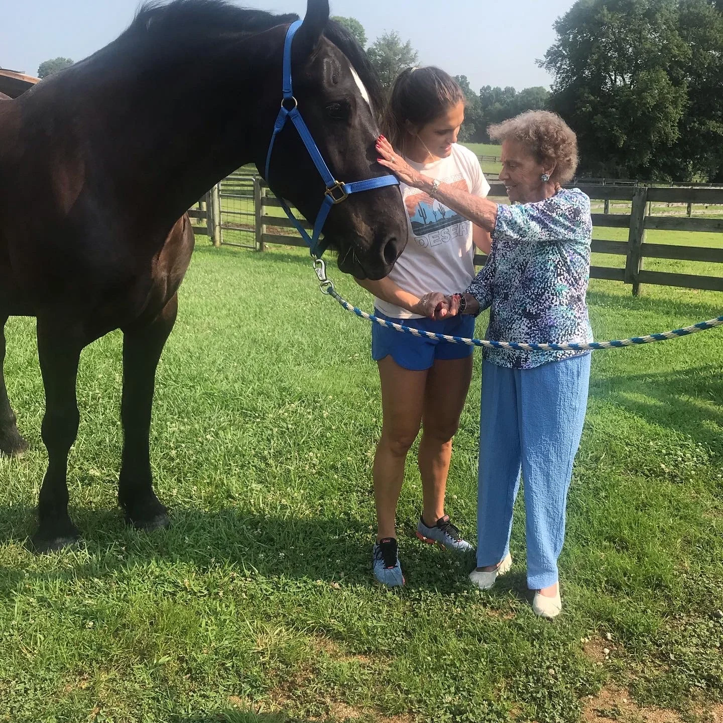 A young woman and an elderly woman with gray hair and a patterned blouse pet a large black horse with a blue halter in a grassy outdoor area with trees and a wooden fence in the background. View fullsize
