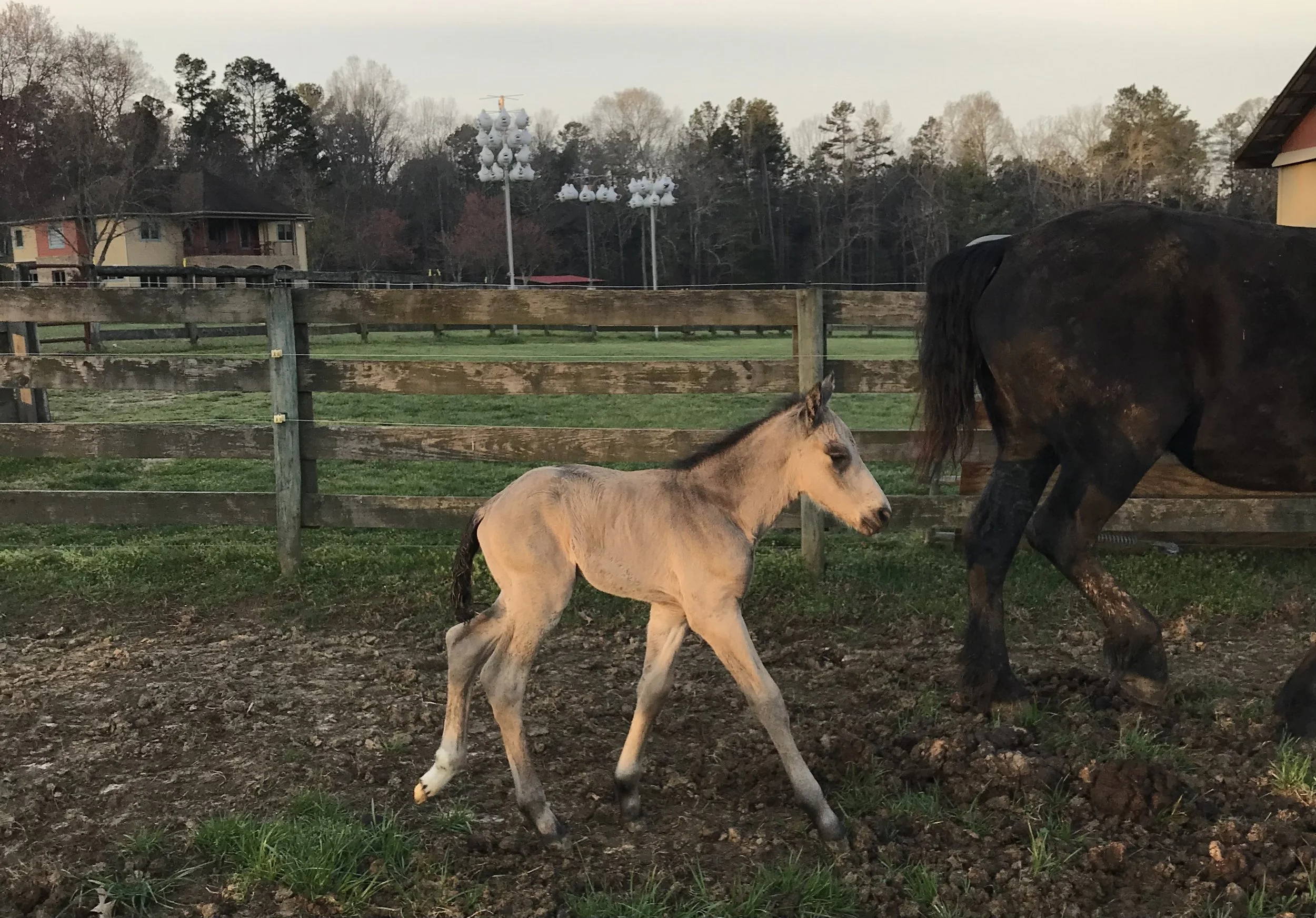 A light-colored foal running near a dark adult horse in a fenced paddock with houses and trees in the background. View fullsize