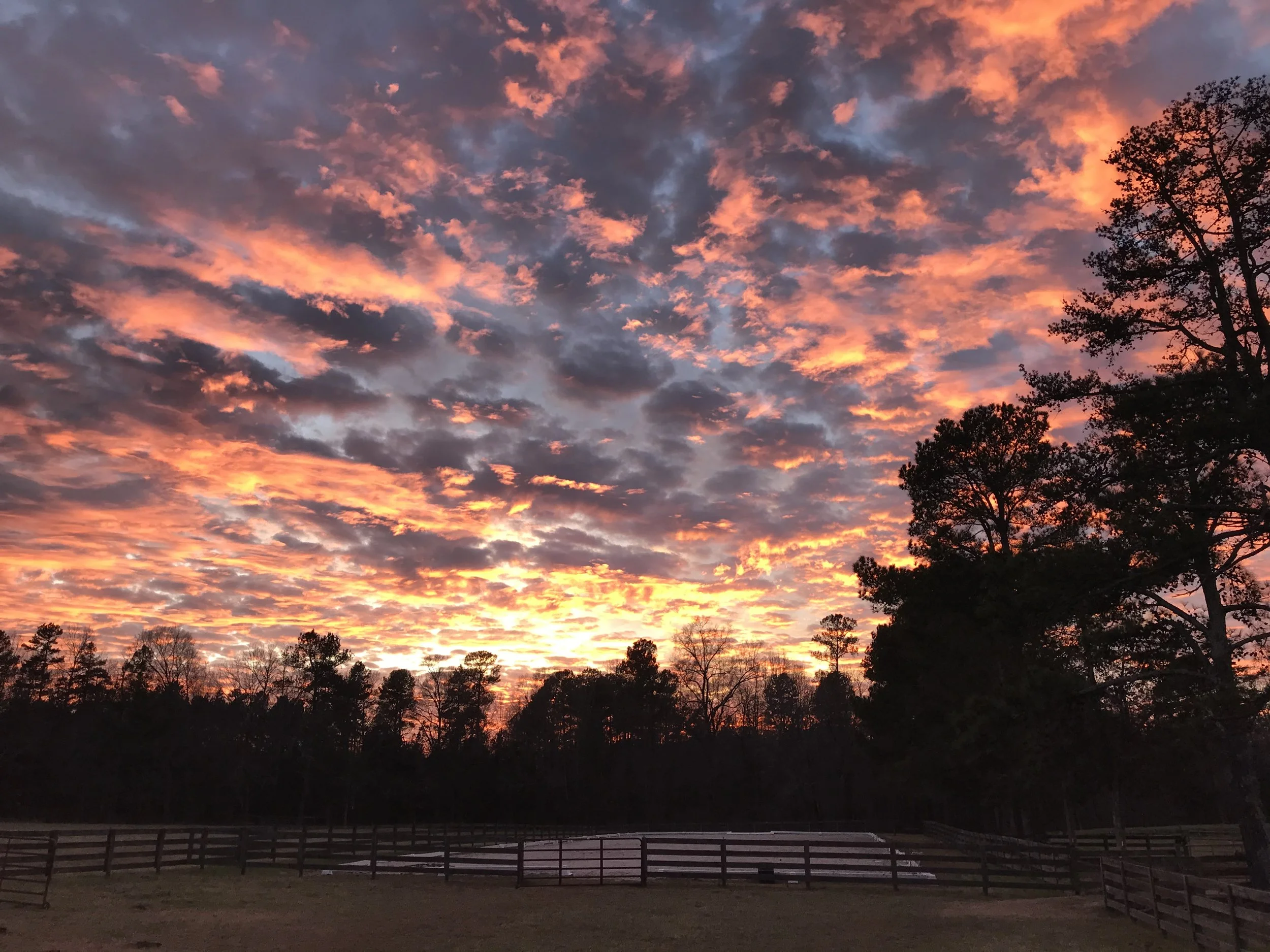 A vibrant sunset with orange, pink, and purple clouds over a silhouette of trees and a fenced area.