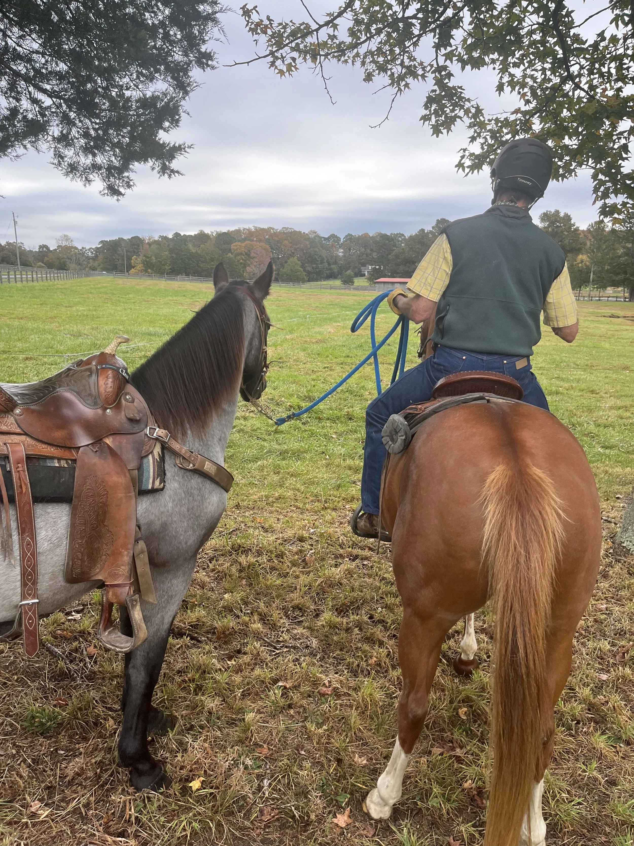 A person riding a brown horse and holding blue reins, with a gray horse equipped with a saddle nearby, in a grassy outdoor area with trees and cloudy sky in the background.