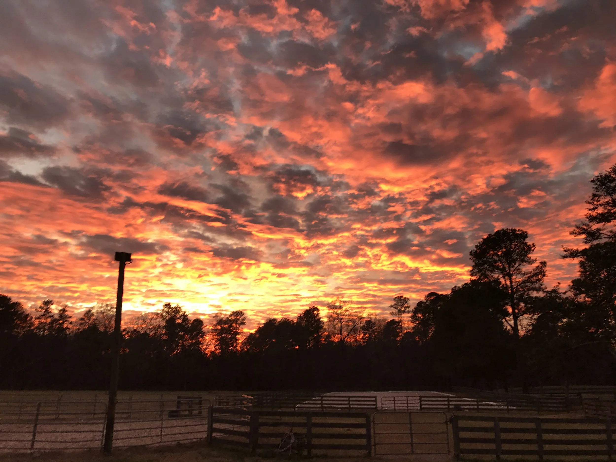 A vibrant sunset with orange, pink, and purple clouds over a silhouette of trees and a fenced area. View fullsize
